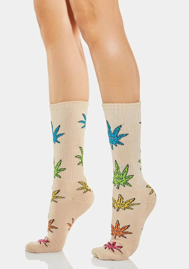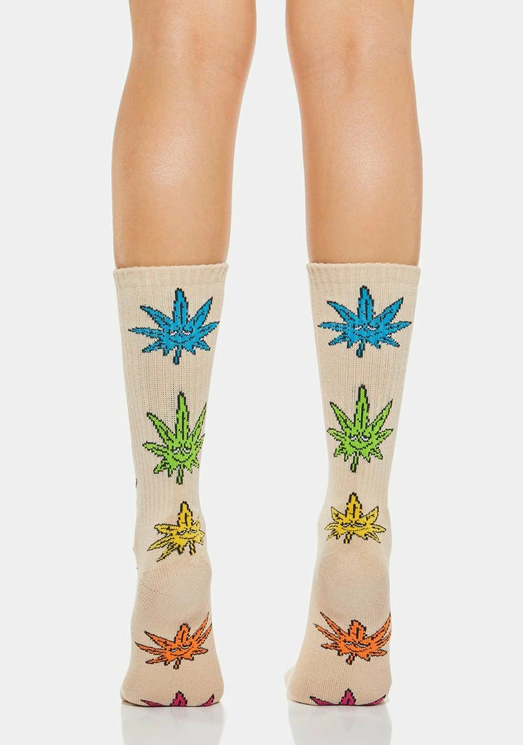 cuz I need a little help from my friends. These crew socks have a ribbed construction, cushioned footbeds, and a repeating rainbow weed leaf graphic.
