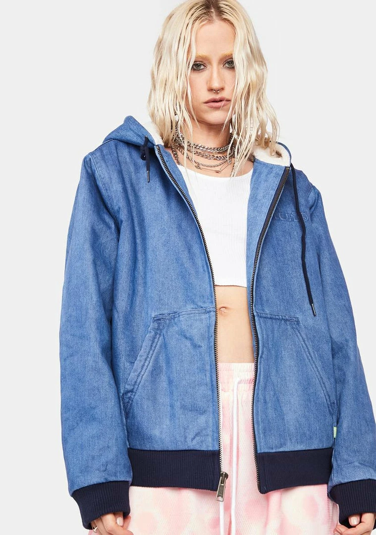 has a denim construction, a fleece inner lining, ribbed trim at the cuffs and hem, a drawstring hood, an embossed HUF logo at the chest and back, and front pockets with a logo tag on one side.