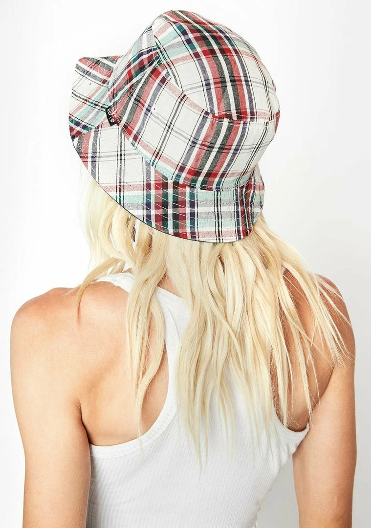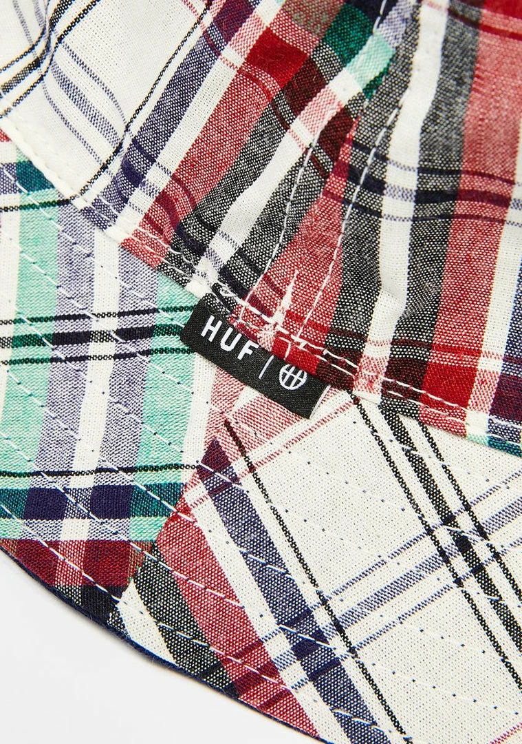 has a solid colored side with an embroidered Huf crown logo and a plaid print on the other side.