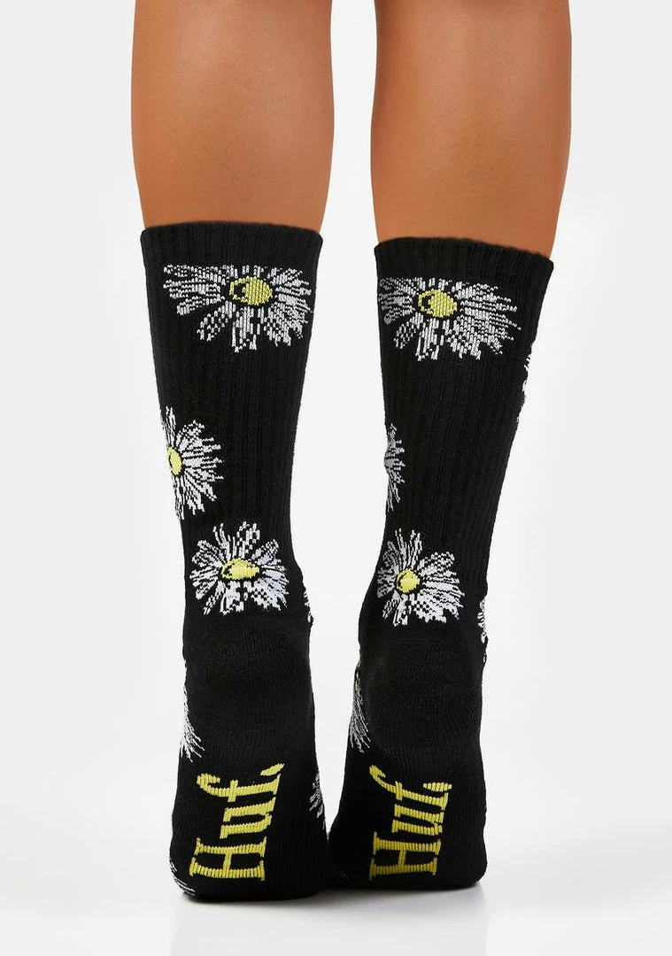 have a ribbed knit construction, a daisy print all over, a crew length fit, and the Huf logo printed on the sole in serif lettering.