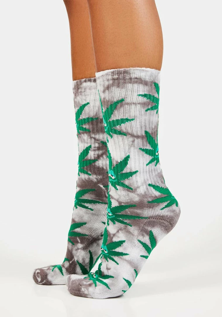 have a ribbed knit construction, a tie dye print all over, a crew length fit, and a classic Huf green buddy plantlife pattern.