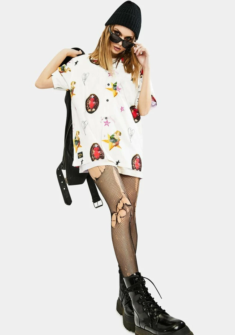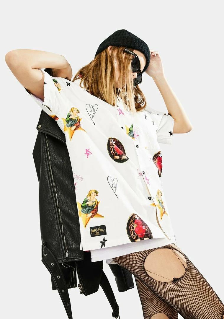 cuz youâre up all night and dreaminâ all day. This smashing pumpkins tribute poplin shirt has stargirl, sacred heart, and hand drawn Billy Corgan “sp” heart logo printed all over.