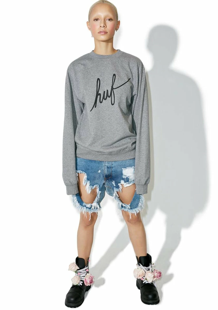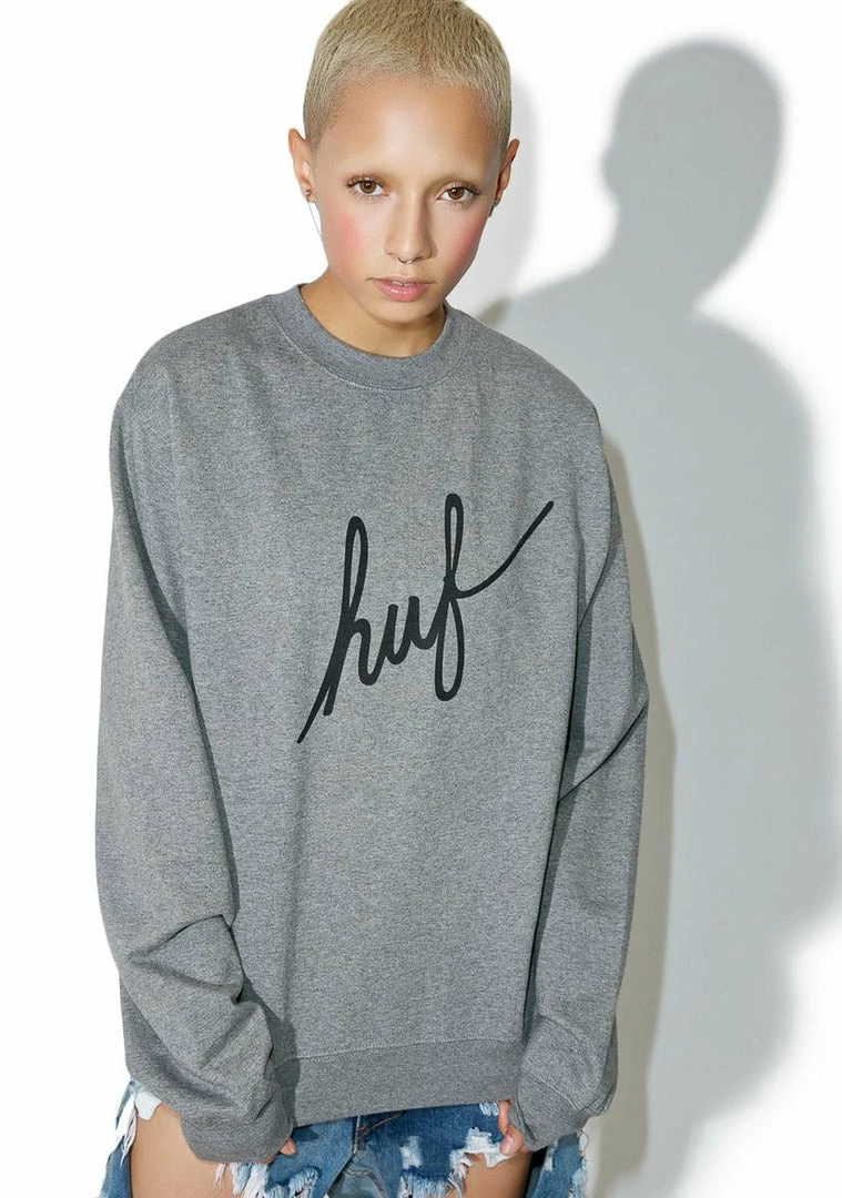 is a classikk, no matter which way ya cut it. This dope oversized crewneck sweatshirt features an ultra soft heather grey construction, rounded neckline, banded cuffs, and simple cursive HUF logo on tha chest.