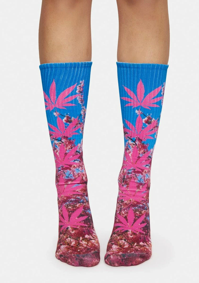 will have you in a dream daze. These ribbed knit crew socks have cushioned footbeds, reinforced heels & toes, and trippy leaf & cherry blossom graphics.