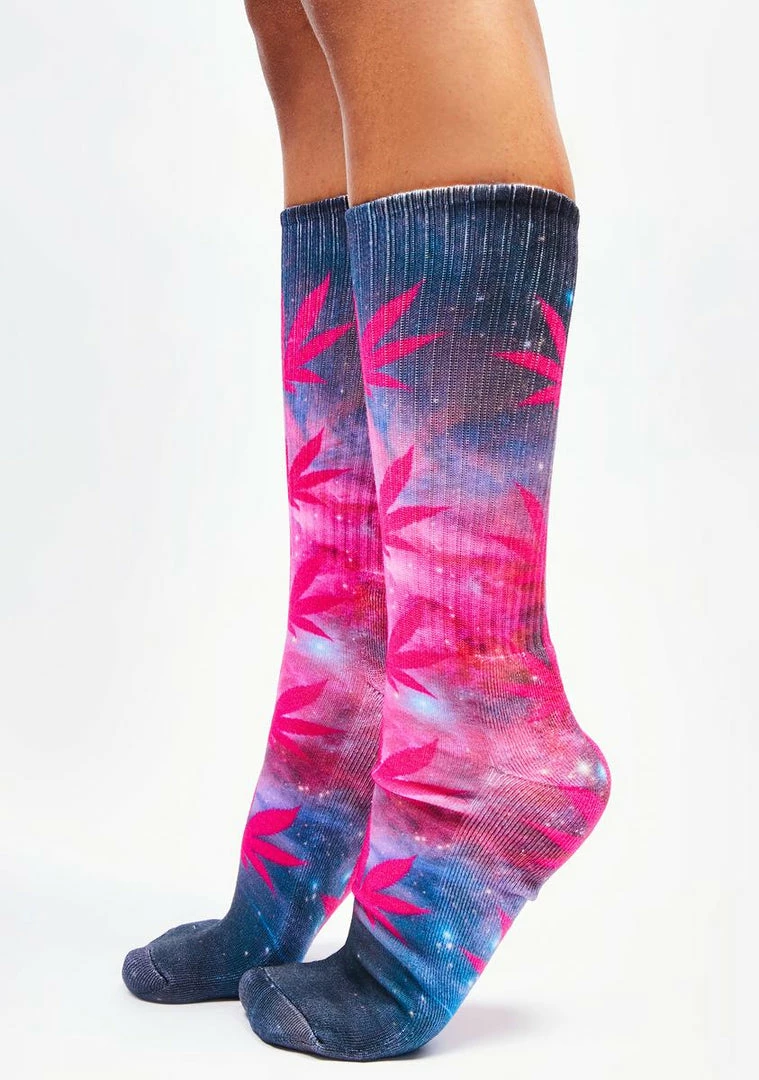 have a crew length fit, a ribbed knit design, and a galaxy plantlife print all over.