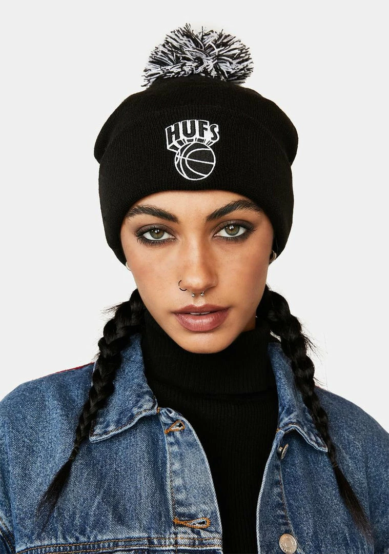 has a ribbed knit construction, a basketball and “hufs” embroidered on the front, and a two tone pom pom.