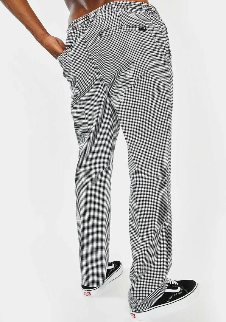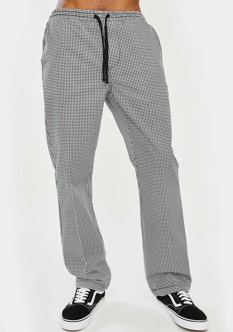 itz clothes before bros! Who says workwear can’t be cozy in these straight leg pants that have a fine checkered print all ova, an elasticized waistband with a drawstring closure, and back pockets with button closures.
