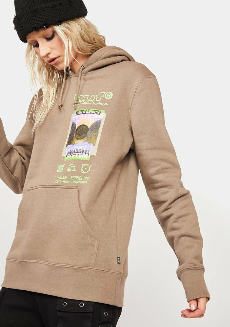 has a fleece inner lining, ribbed trim at the cuffs and hem, a drawstring hood, a front pouch, a HUF emergency broadcast system graphic printed on the back, and a mini version on the front.