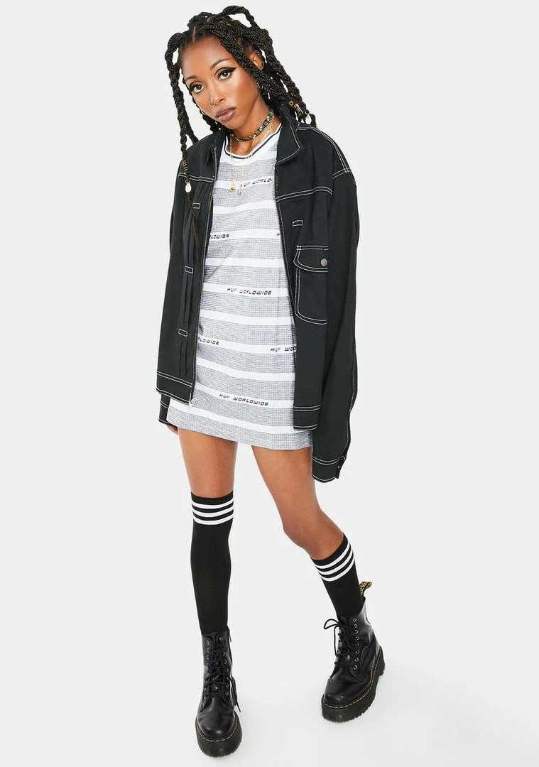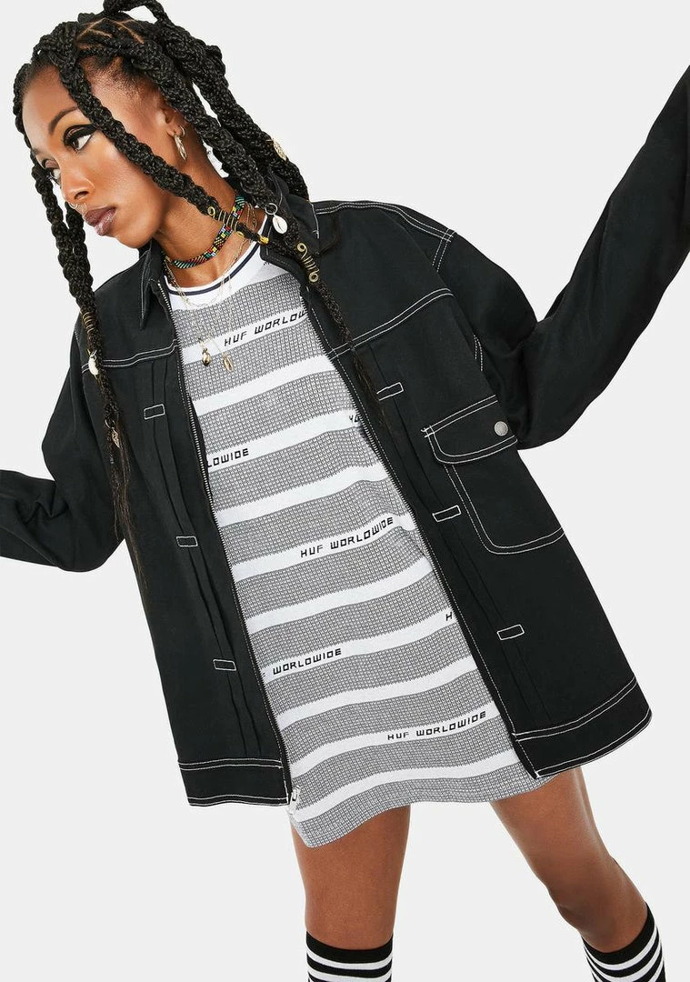 youรขยยve earned your stripes. This short sleeve knit top has a striped pattern and the HUF logo printed all over.