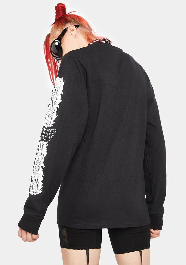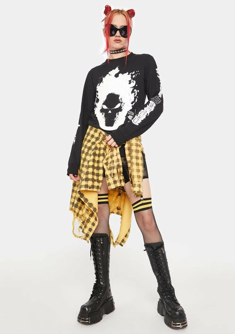 you bring the mayhem. This long sleeve tee has a cotton construction, a crew neckline, ribbed sleeve cuffs, and Ghost Rider graphics printed across the front and down the sleeves.