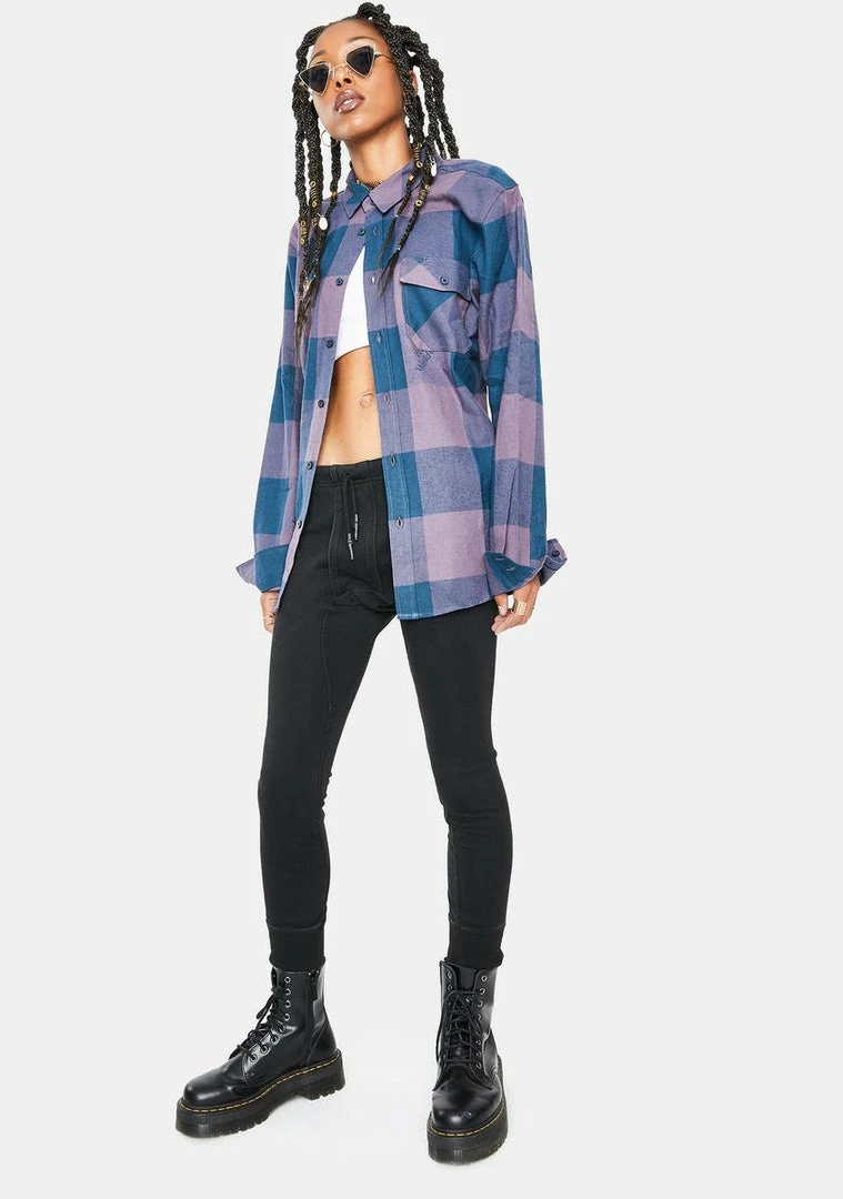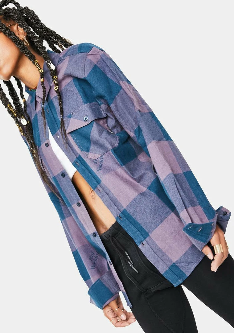 for reaching your peak potential. This soft flannel long sleeve has flap chest pockets, a button up front, an all over buffalo check pattern, and a secret stash pocket at the back of the collar.
