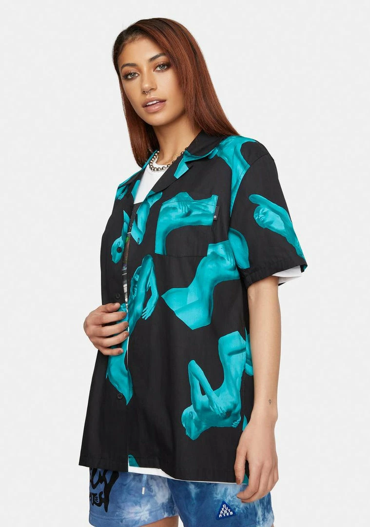 features short sleeves, a collared neckline, button front closure, front chest pocket, and outstretched lady graphic printed all over.