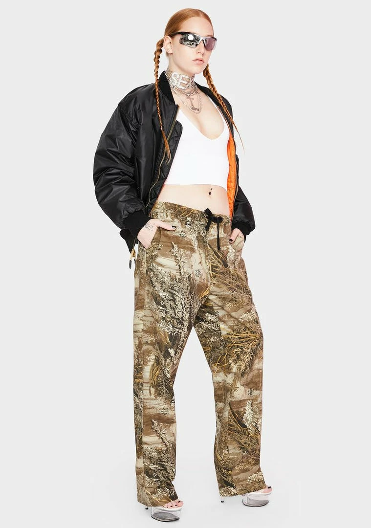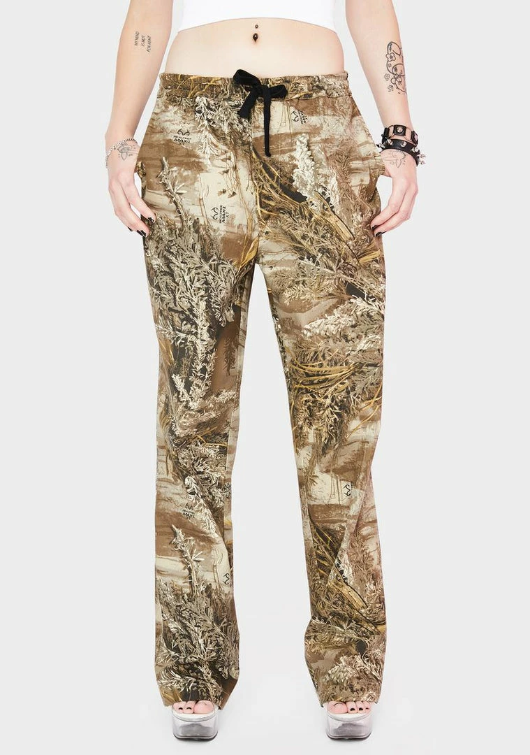 because you keep it lowkey. These mid-rise camo pants have a baggy straight leg fit, stretchy drawstring elastic waistband and pockets at the waist and back.