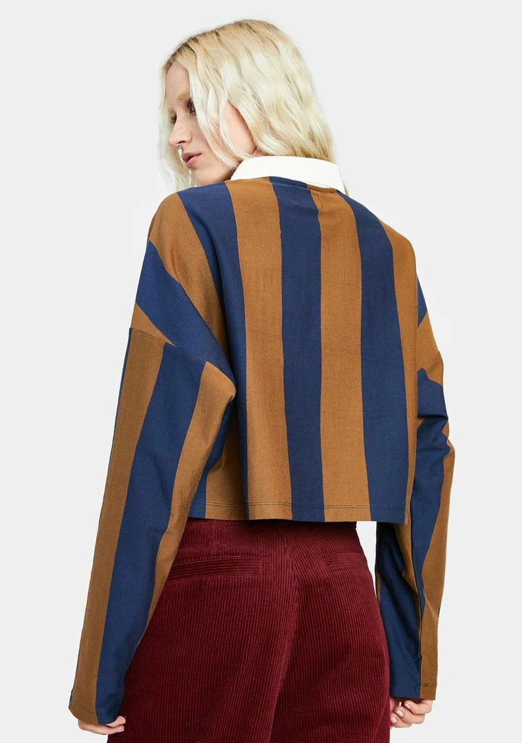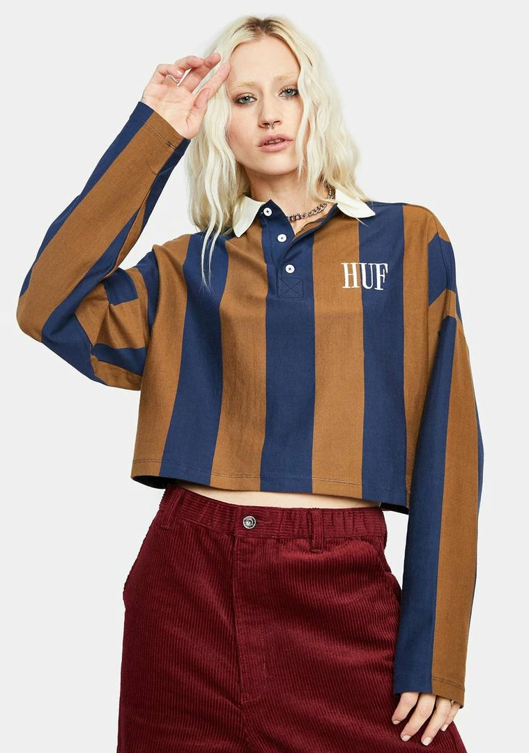 has a cropped waist, long sleeves, a collared neckline with a button up, a striped pattern all over, and the huf logo embroidered on the chest.