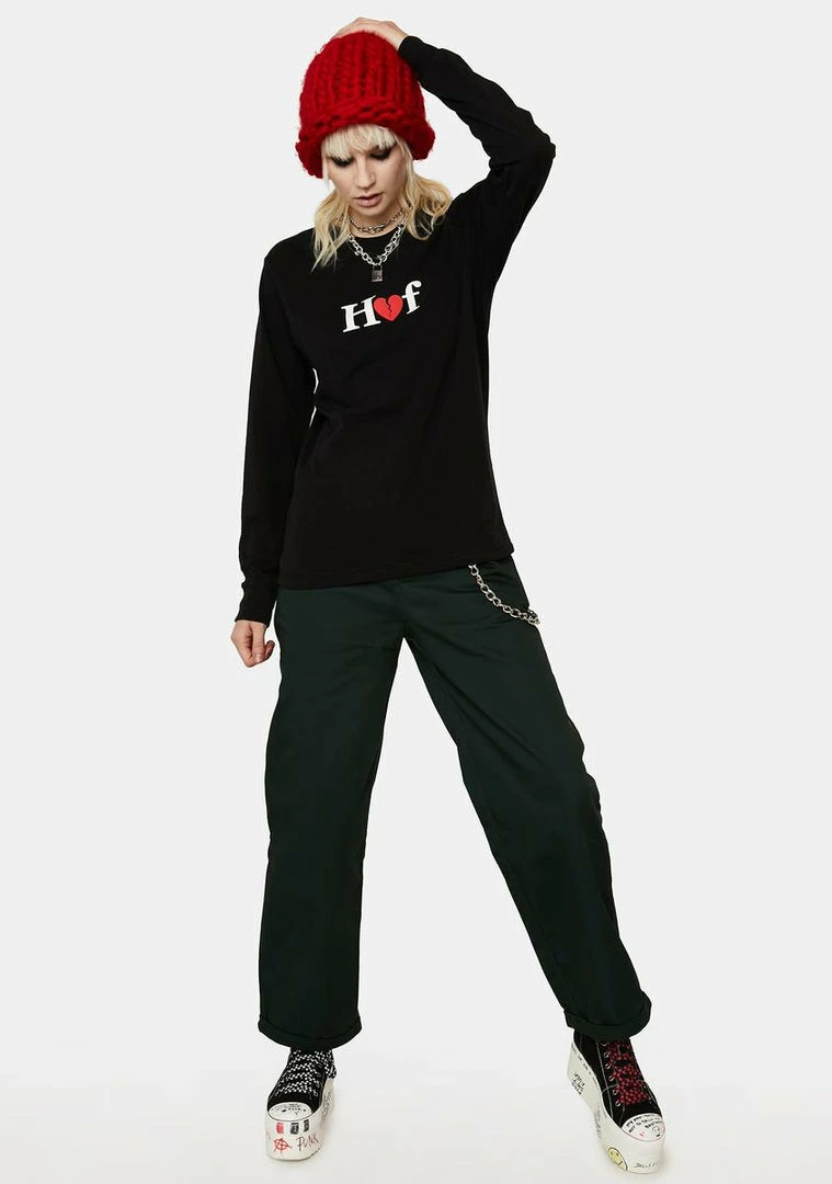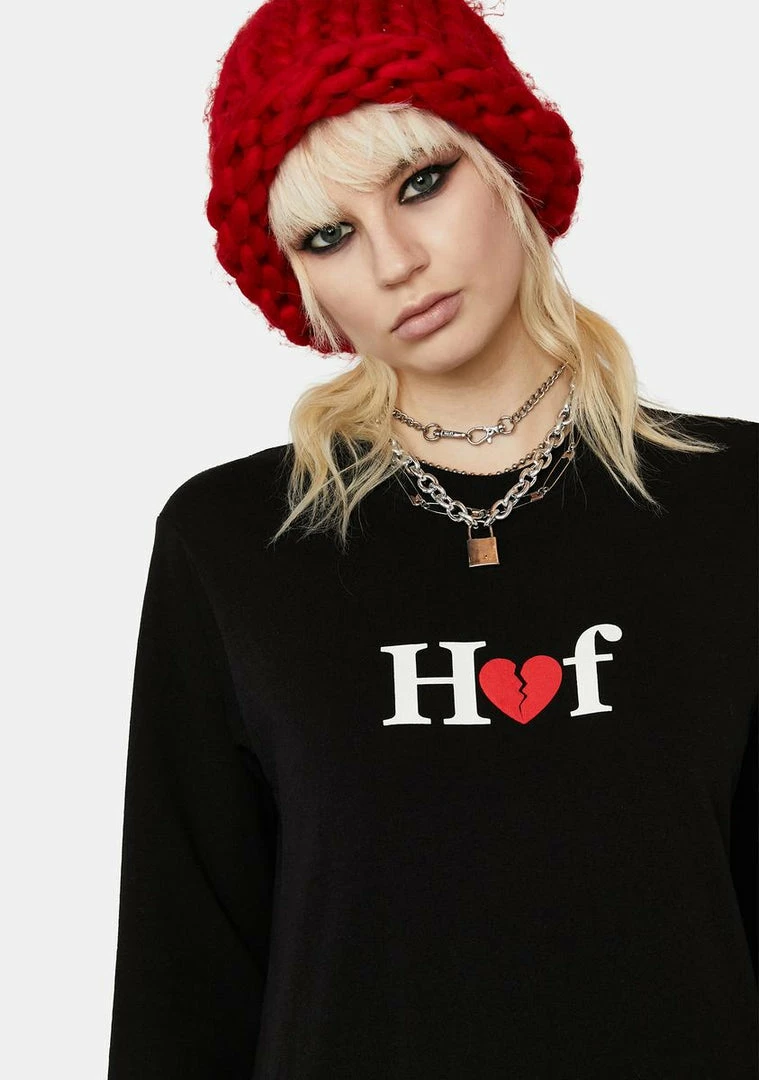 has long sleeves, ribbed trim at the cuffs and crew neckline, the Huf logo printed on the front with a broken heart icon, and a similar pattern up the sleeves.