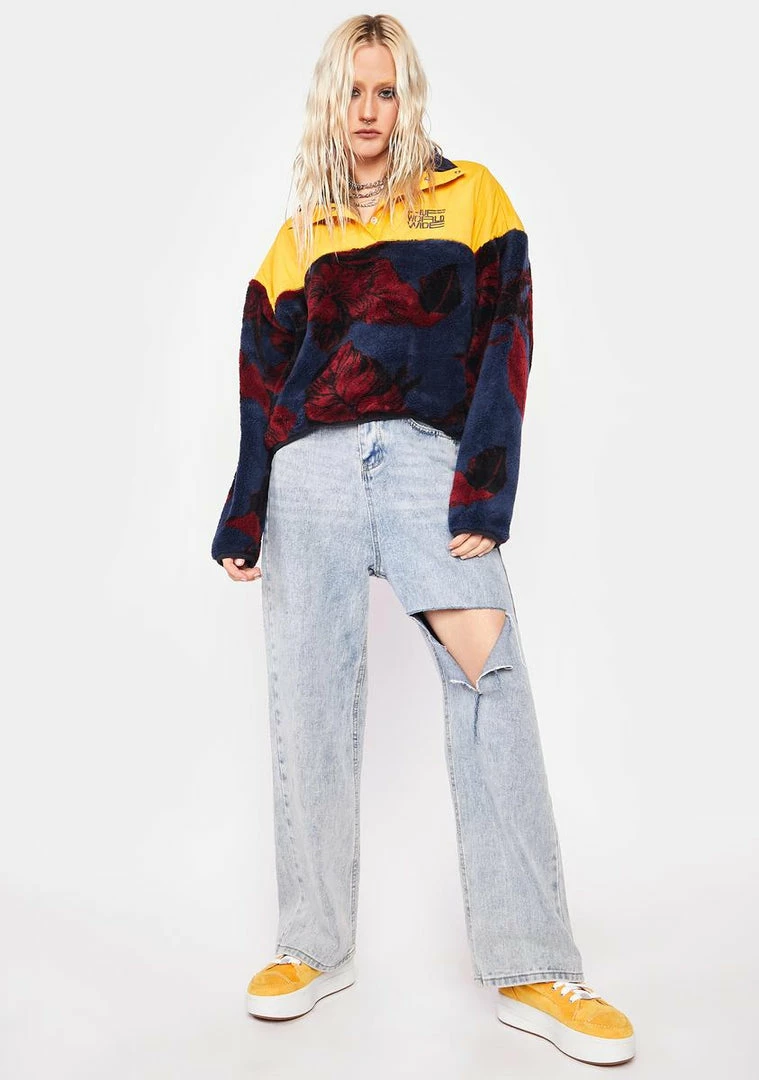 has a soft sherpa construction with a floral print, contrast colored waterproof nylon panels, a button up at the bust, and Huf Worldwide embroidered on the chest.