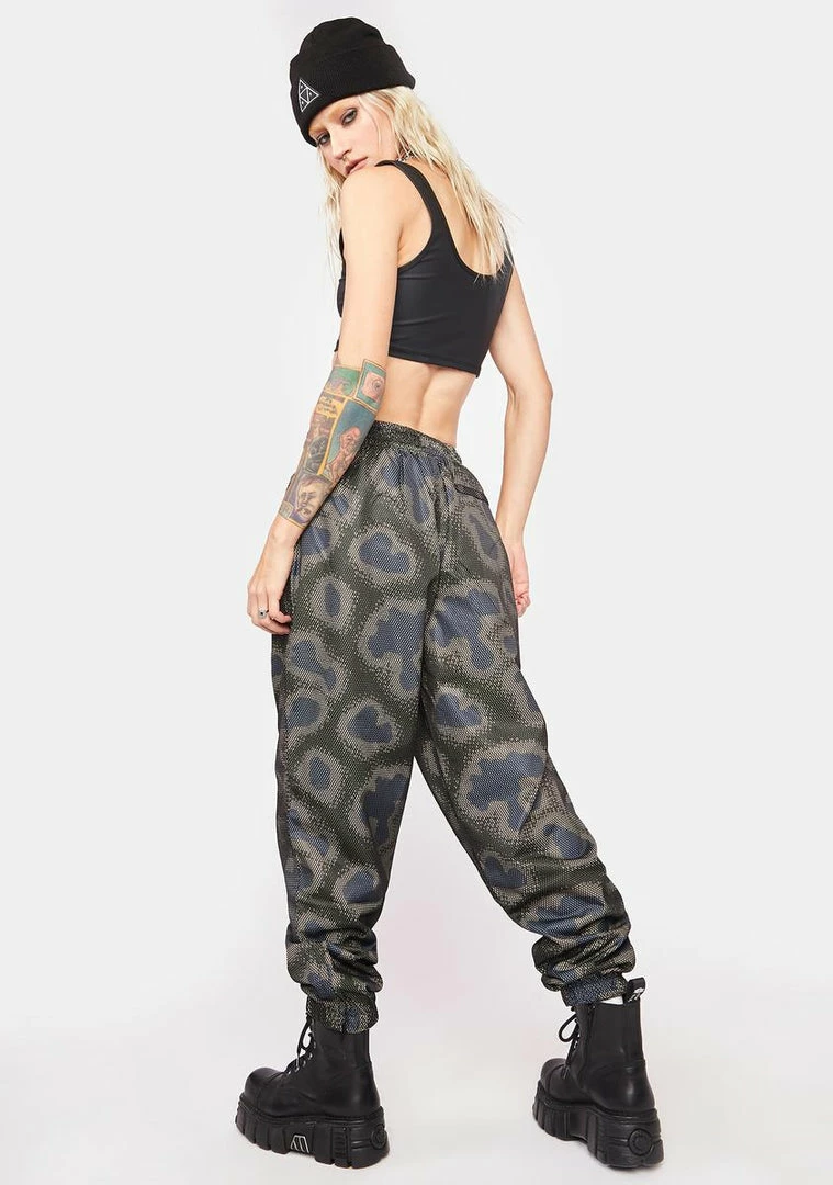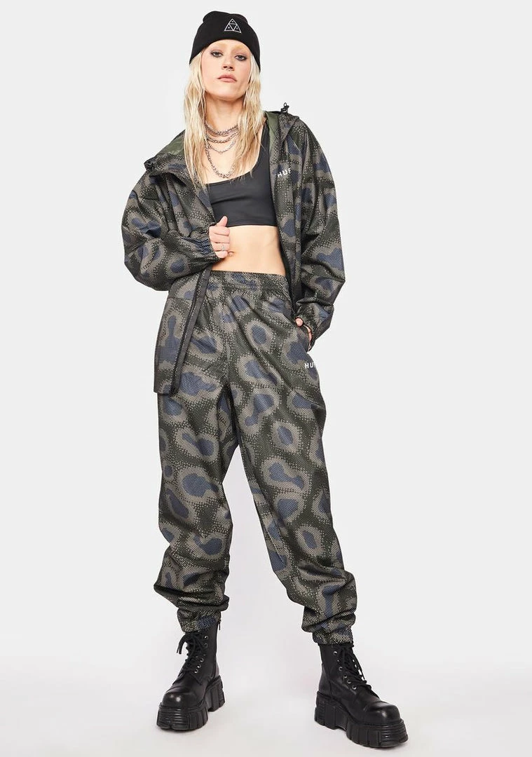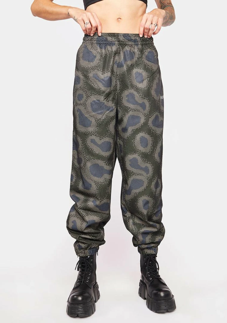 has a waterproof nylon construction, a mesh overlay, an elastic waistband and ankles, side pockets, an abstract print all over, and a relaxed fit.