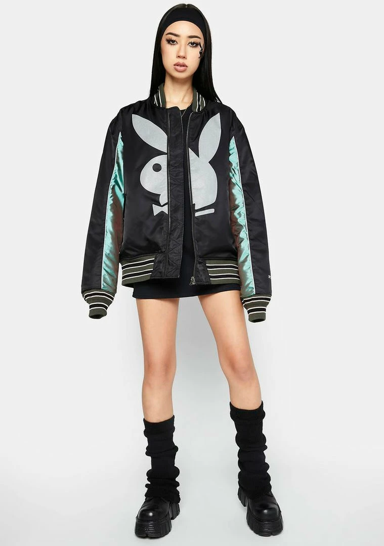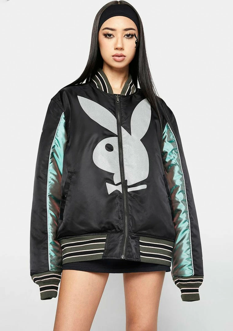 cuz you’re a jetsetter. This reversible bomber jacket has a padded nylon construction with iridescent panels, Playboy bunny graphics, snap button side pockets, elastic ribbing at the collar, hem, and cuffs with stripe details, reflective piping, and a front zip closure.