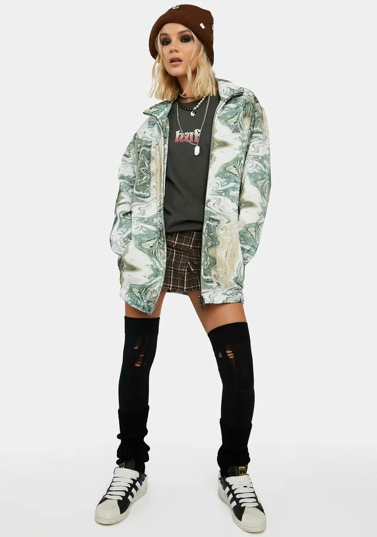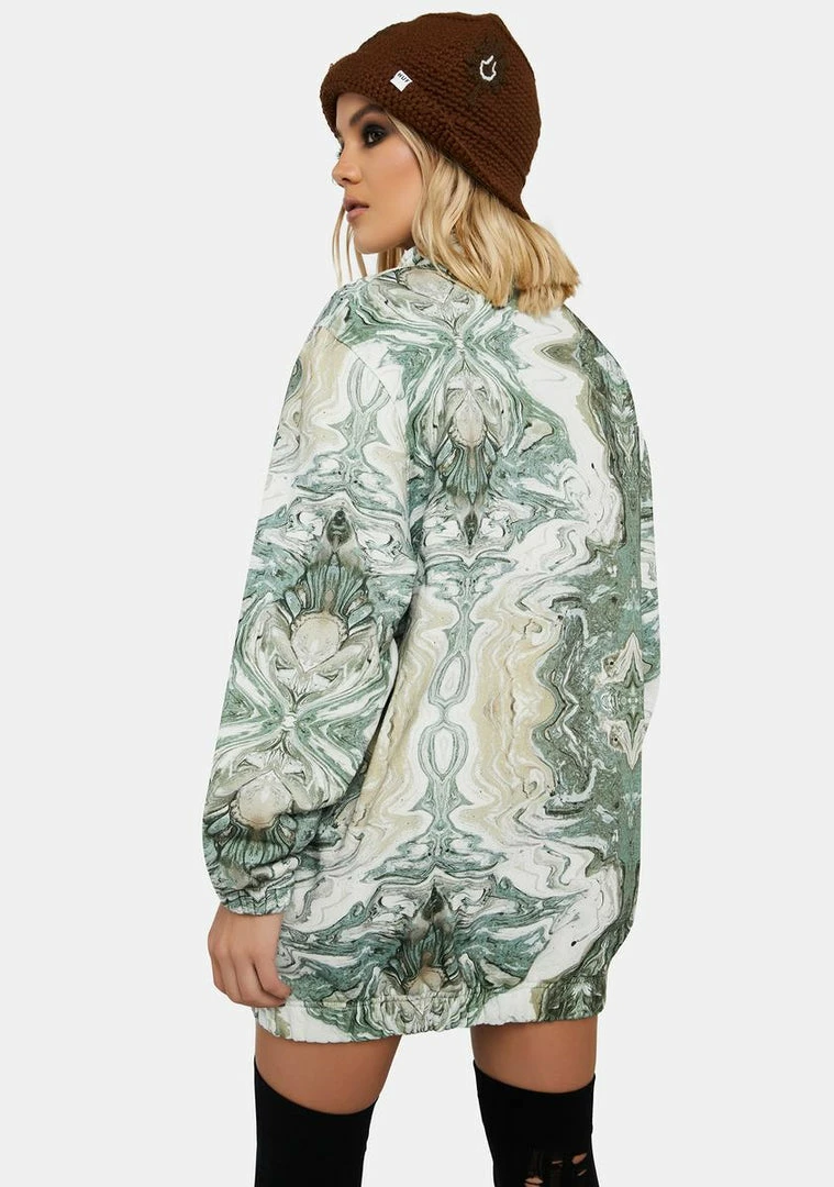 cuz keeping warm never looked so cute! This oversized jacket has a fleece construction, a marbled swirl print all over, a mock neckline, drop shoulders, elasticated cuffs, a front zip closure, and side pockets.