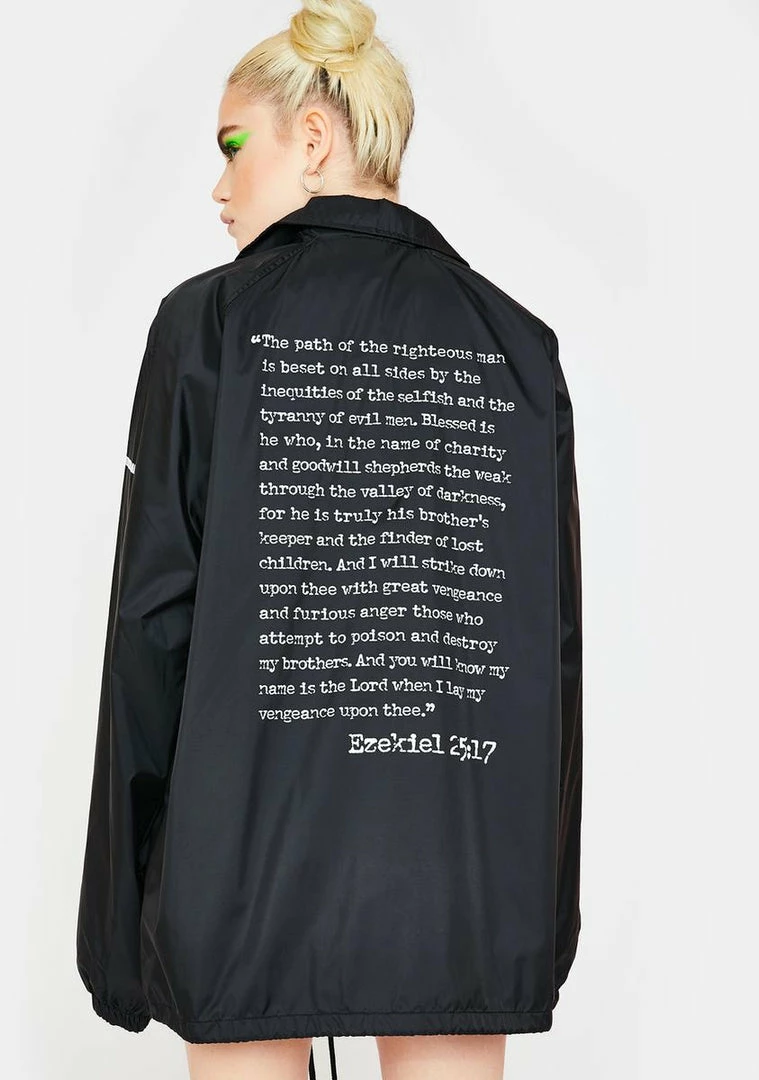 cuz you’re a bad motherfucker! Look iconic AF in this nylon coach jacket that has Ezekiel’s infamous passage on the back, a drawstring waistband, snap button closures N’ pockets on the sides.