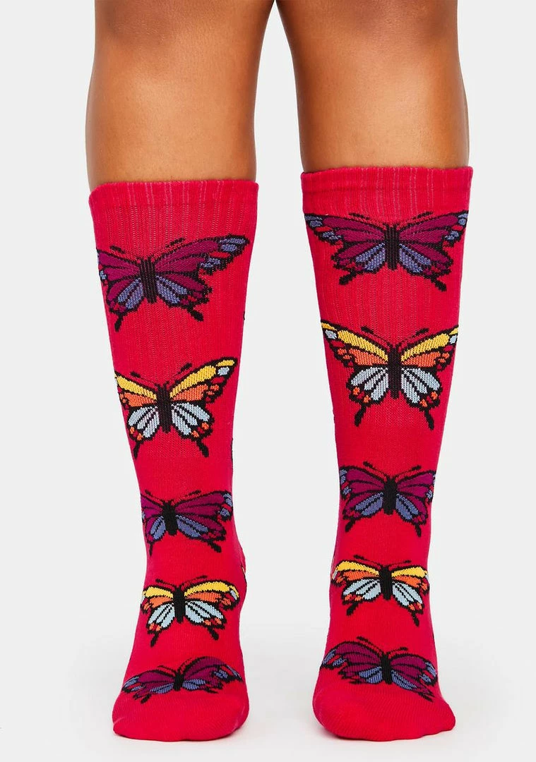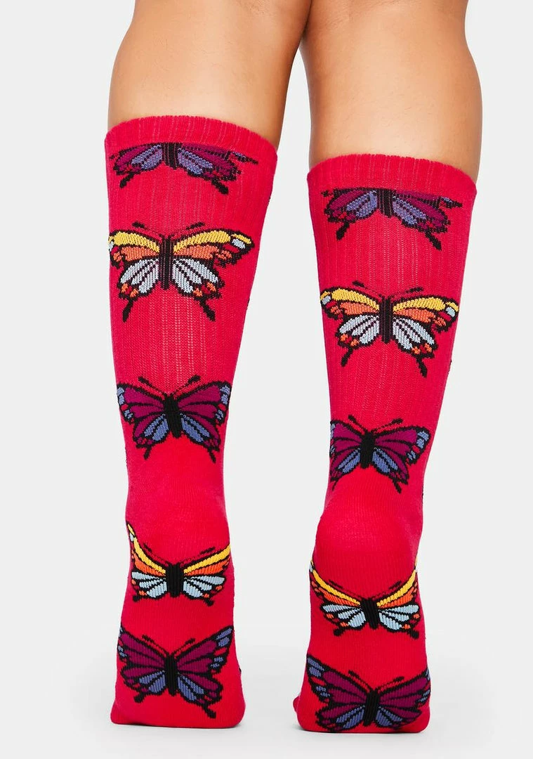 will take you somewhere over the rainbow. These retro-inspired, psychedelic crew socks have a jacquard butterfly print, cushioned footbeds, and reinforced heels & toes.