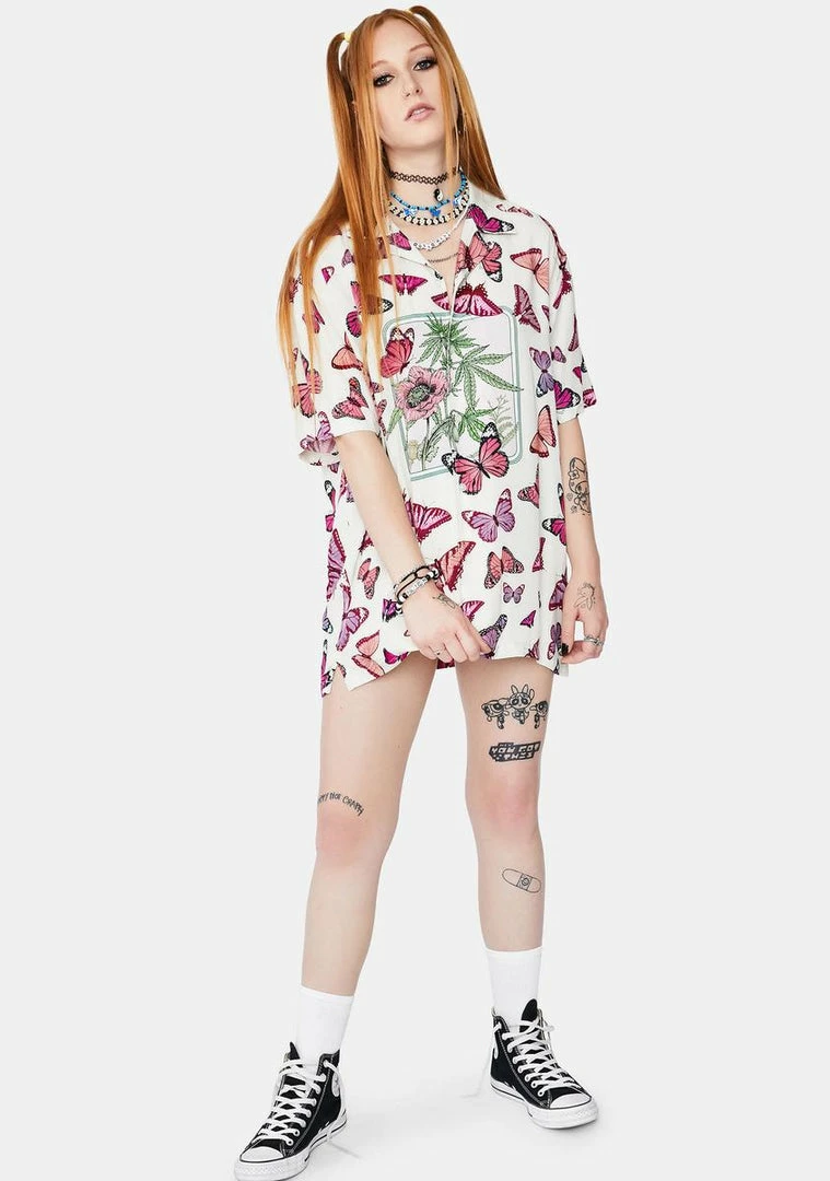 it’s easy breezy. This button up shirt has a butterfly print all over, plant life graphics, a pointed collar, and a hidden stash pocket.