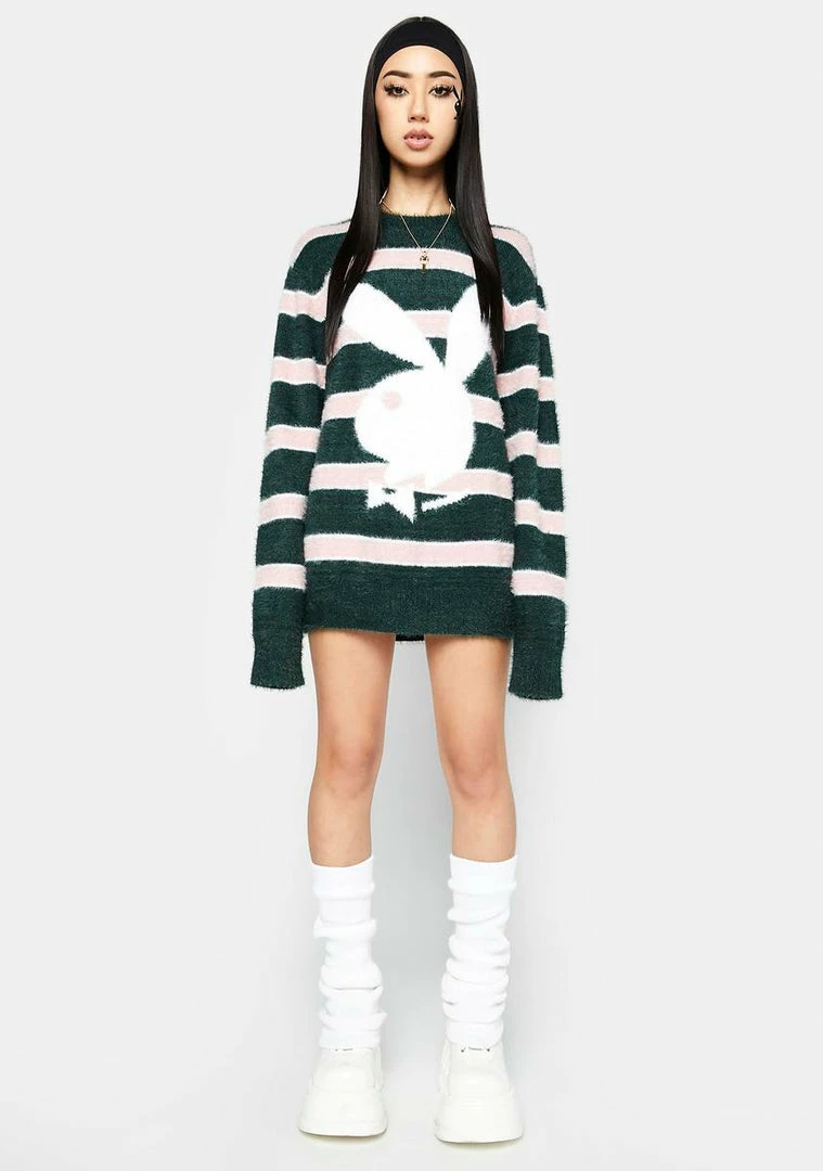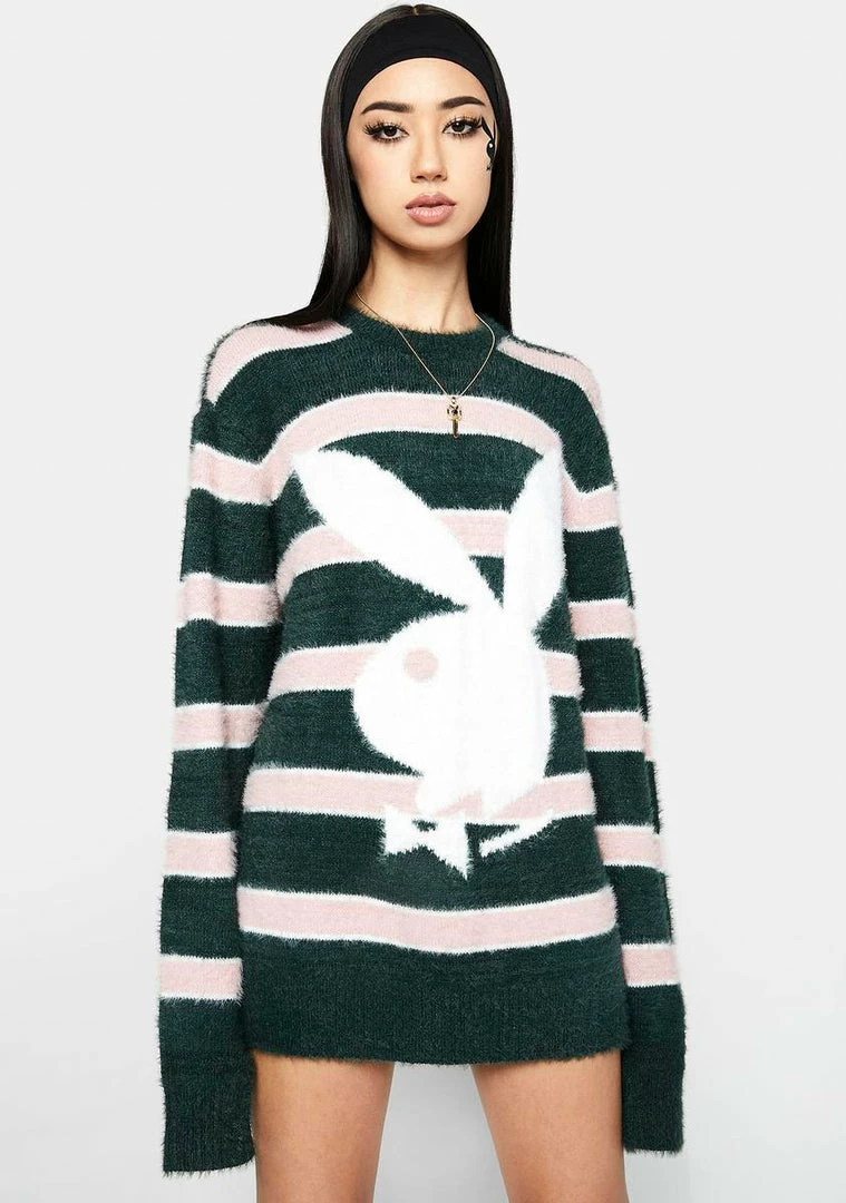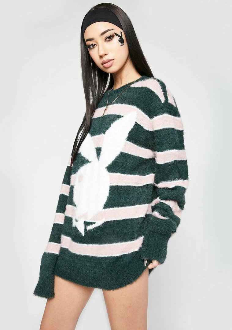 cuz your life is the sweetest. This super soft faux mohair sweater has a relaxed fit, a striped pattern all over, a ribbed collar, hem, and cuffs, and jacquard Playboy bunny and logo graphics on the front and back.