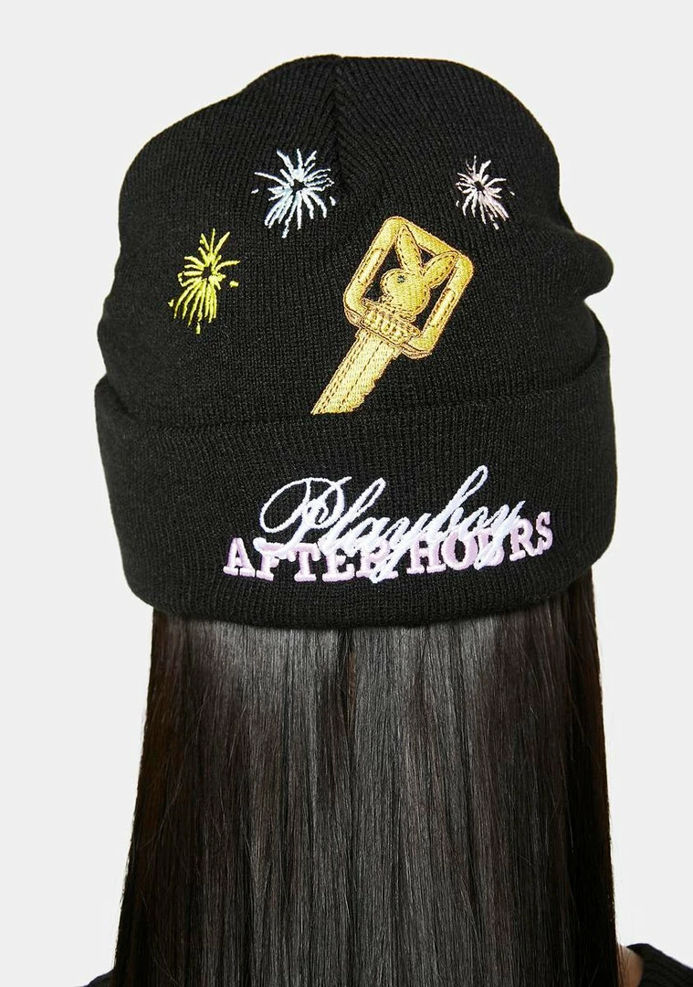 cuz the party doesn’t stop! This ribbed knit beanie has a fold up cuff and embroidered Playboy graphics on the front and back.