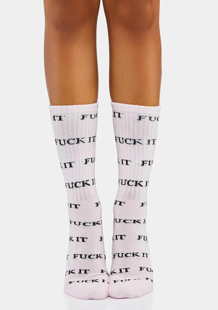 feature a repeating ‘Fuck It’ print all over, ribbed uppers, cushioned footbeds, and reinforced heels and toes.