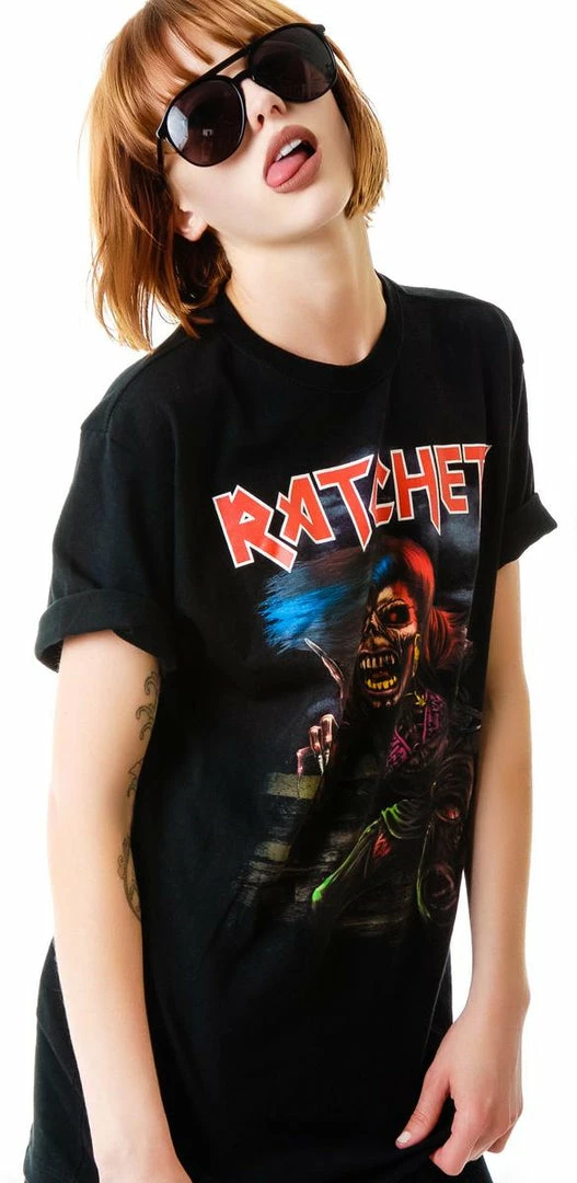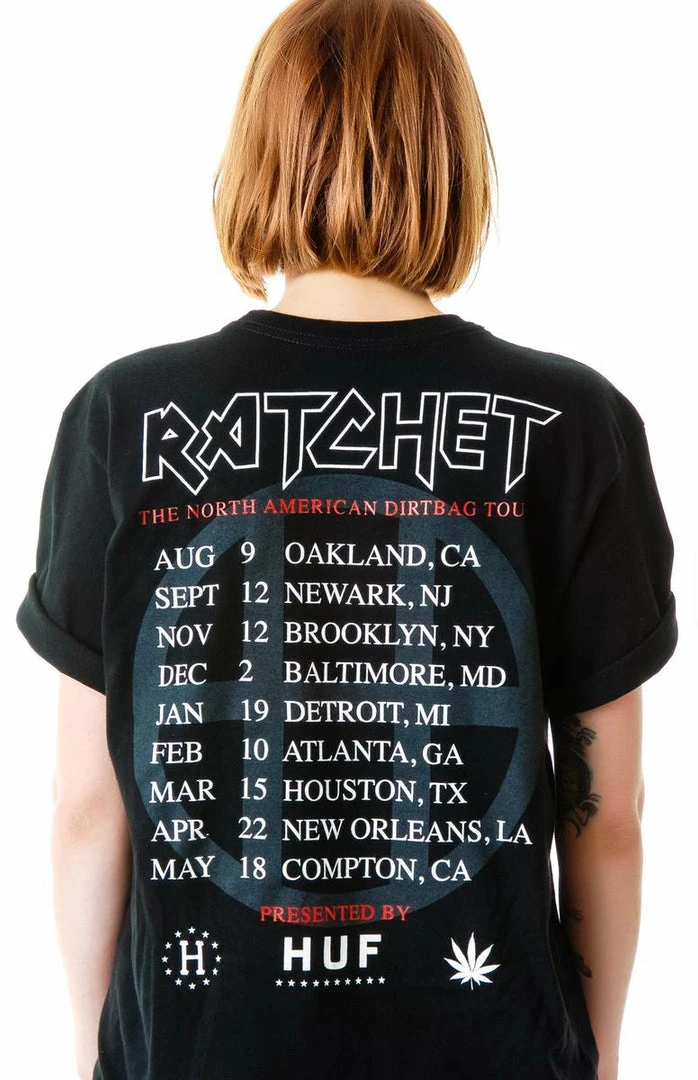 HUF Ratchet Tour Tee is for all our Maidenhead hood rats who are gonna recognize the super familiar lookin’ metal band font being used for “Rachet”. The ratchet ho flashing her coochie at you even looks like Eddie their mascot. If ya flip this baby around you’ll notice all the tour dates on the back. Guess they wanted to tour the most rachet rat filled cities possible..This rad as hell tee features a crew neckline and the relaxed fit makes this piece to work diff ways. Cut it up, distress it, or tie it up, it won’t be hard to rock out to 666 the Number of the Beast in this bad boy.