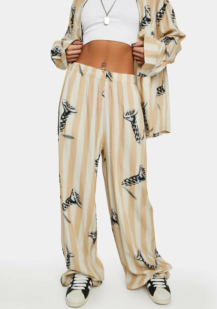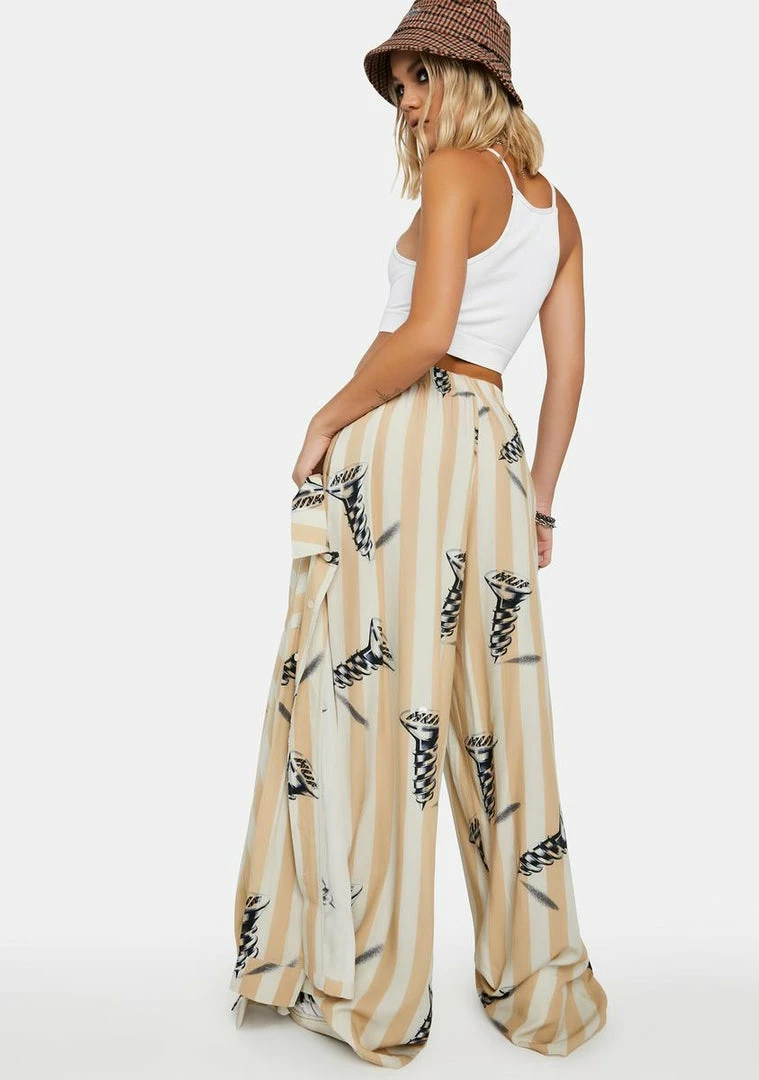 cuz that’s your motto. These pants come with an elasticated high waist, flared leg, front pockets, stripped pattern, and screw print all over.