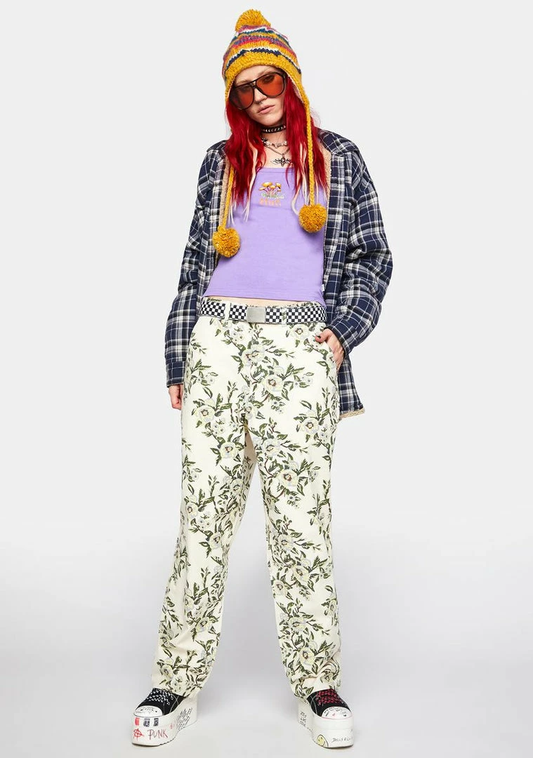 ready for a trip. This tank top has a square neckline, cami straps, a mushroom graphic at the center of the chest, and a cropped fit.