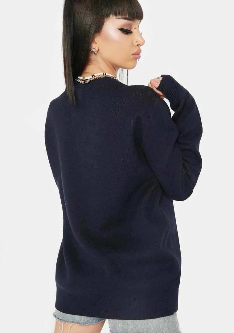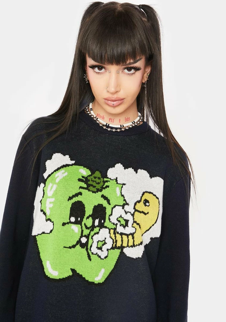 cuz it’s 420 somewhere. This sweater has a super soft knit construction, a ribbed crew neckline, cuffs, and hem, long sleeves, and jacquard weed themed artwork on the front.
