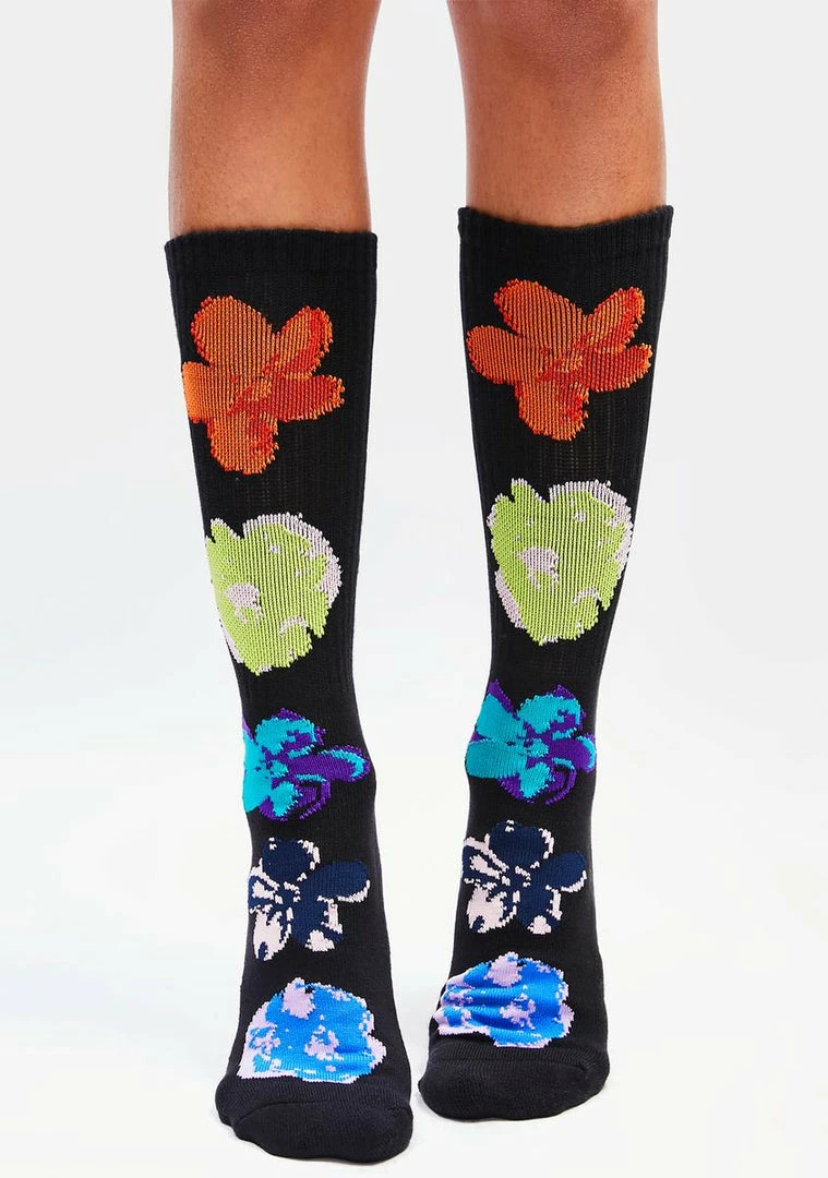 have a crew length fit, a ribbed knit design, different florals up the front, and a huf logo on the sole.
