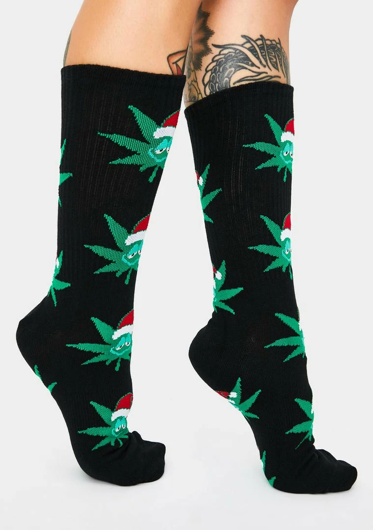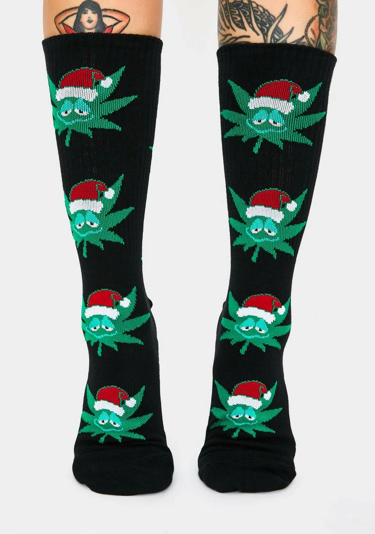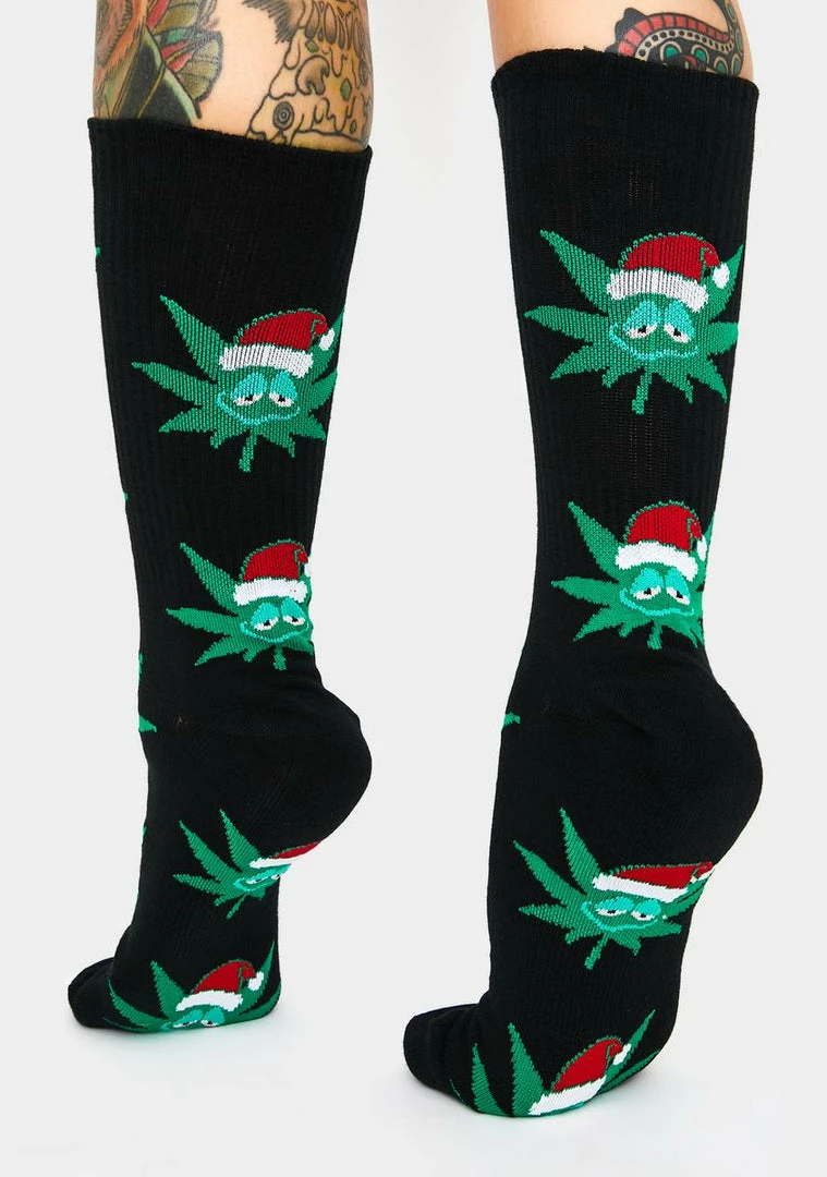 give the gift of grass this season! Stay high in these too lit socks that have a cozy ribbed knit, cushioned footbeds, and a santa weed leaf print all ova.