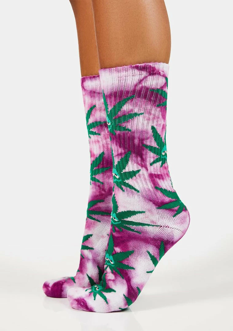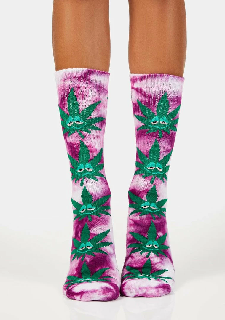 have a ribbed knit construction, a tie dye print all over, a crew length fit, and a classic Huf green buddy plantlife pattern.