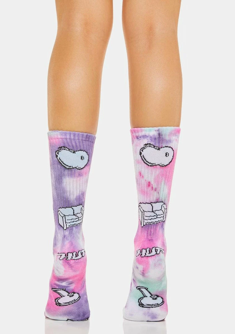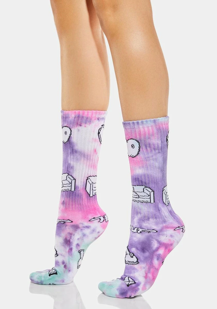 wait, what were we talking about? These crew socks have a ribbed construction, a tie dye design, and stoner inspired graphics.