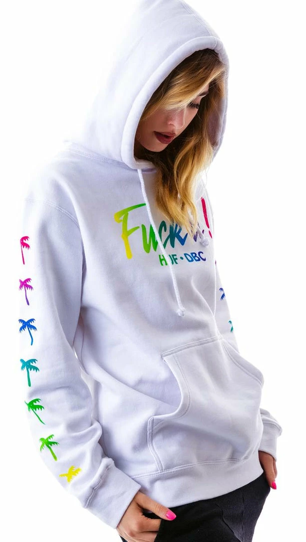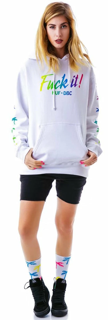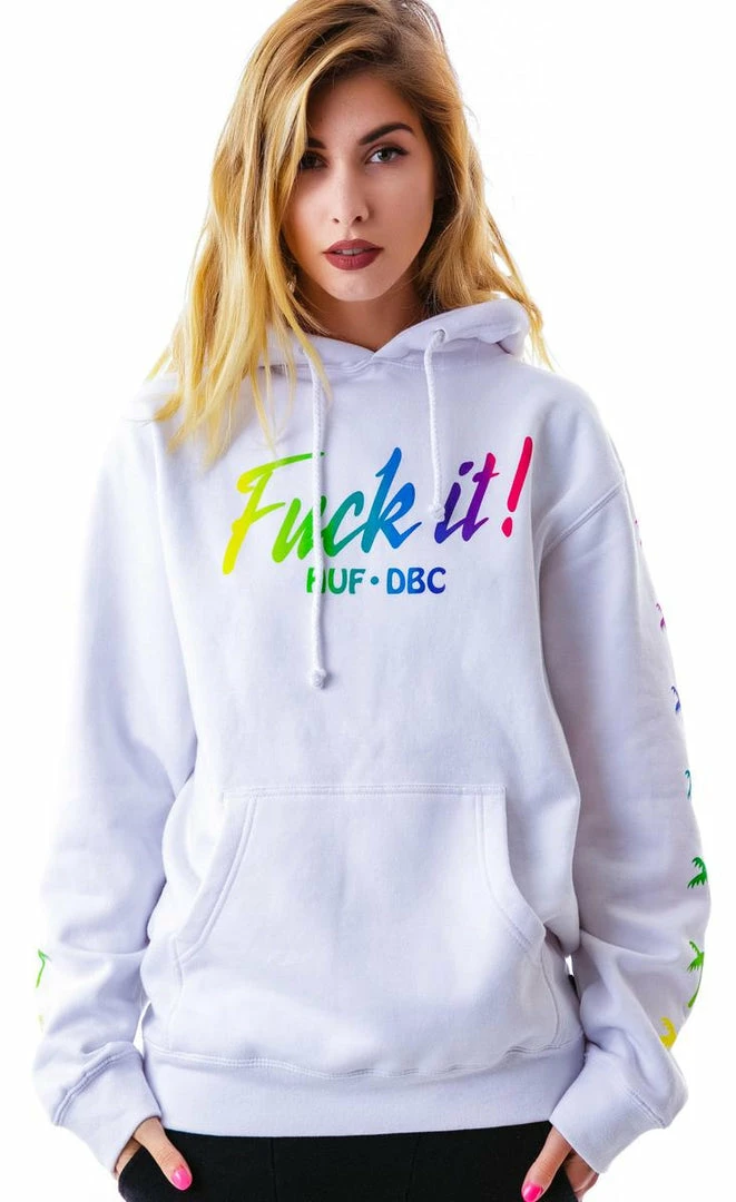 HUF Spring Break Pullover is ready to fukkinΓΒ rage. This kickazz pullover hoodie is ready to do keg stands and throw up the middle finger any second. With itΓΒs sofffft az fukk fabric thatΓΒs really the only cute thing about this BB. FeaturinΓΒ graphic multicolored palm trees down each arm and a graphic ΓΒFUCK IT!ΓΒ across the chest this is the coolest sweater around. The only question is can you keep up?