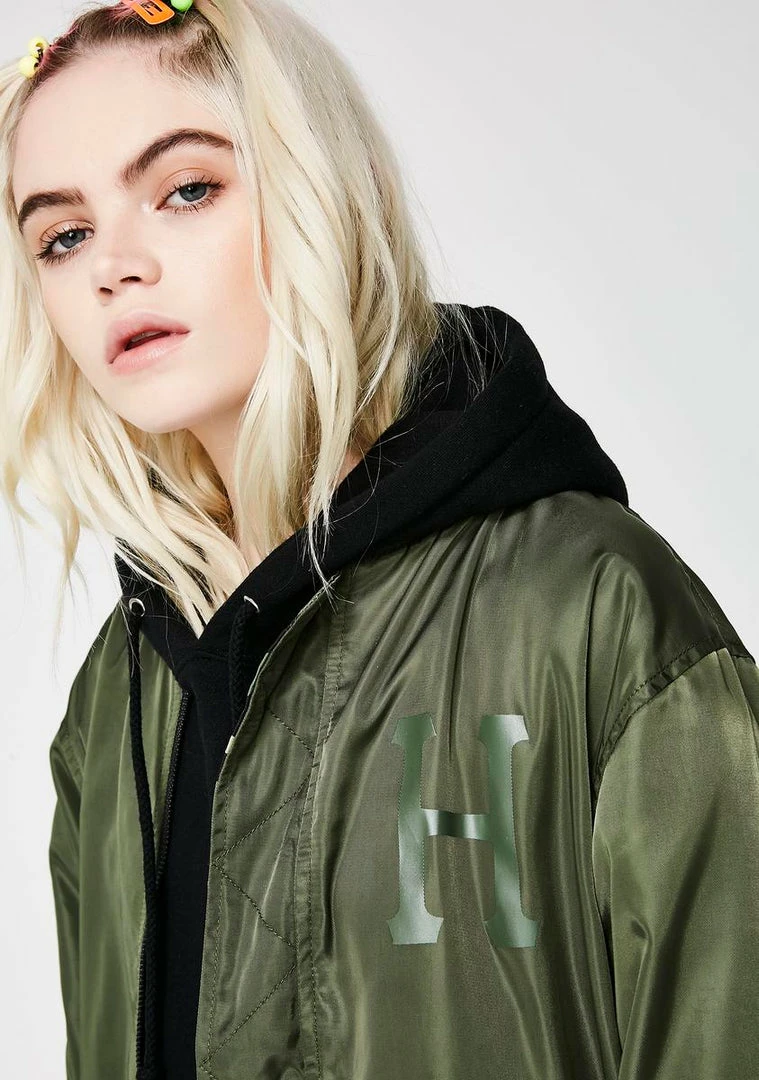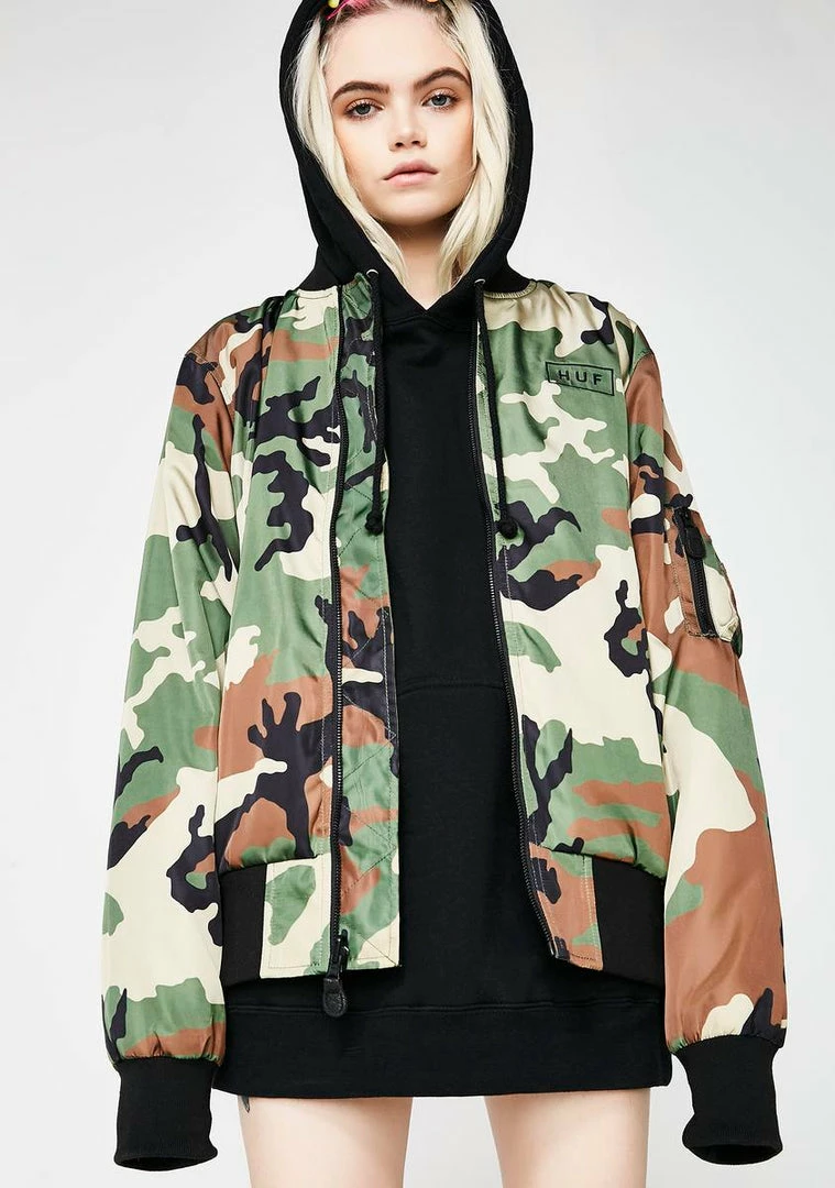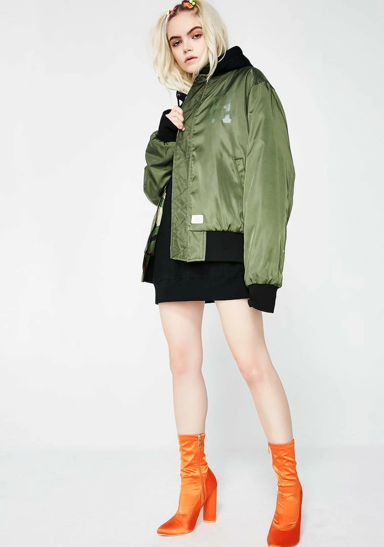 cuz youâre up to no good. Take flights with this bomber jacket that has a camo print all ova, a logo on the front, a reversible olive lining with a H details and a zip closure.