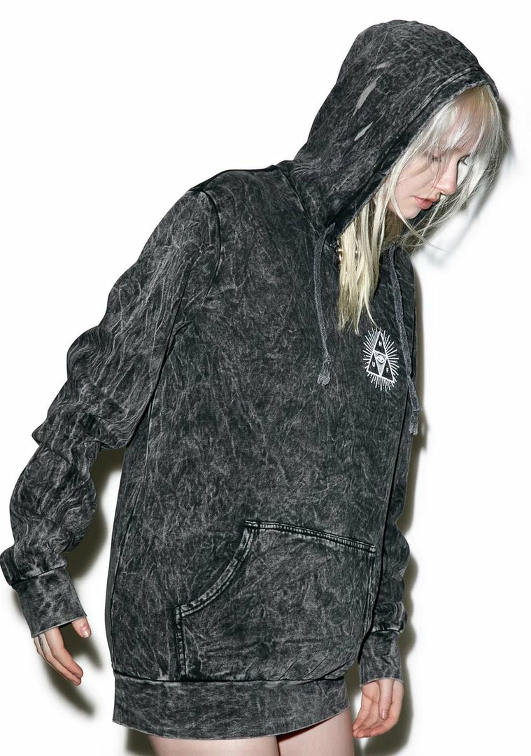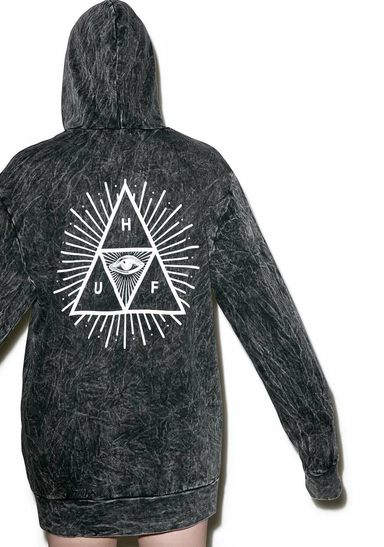 …can you be trusted, babe? Show âem that yer all about secret societies ân conspiracies in this dope pullover hoodie, featurinâ a super soft black acid wash construction, banded trim, a front pouch pocket, and triangle HUF logo with Illuminati eyez on the chest ân back.