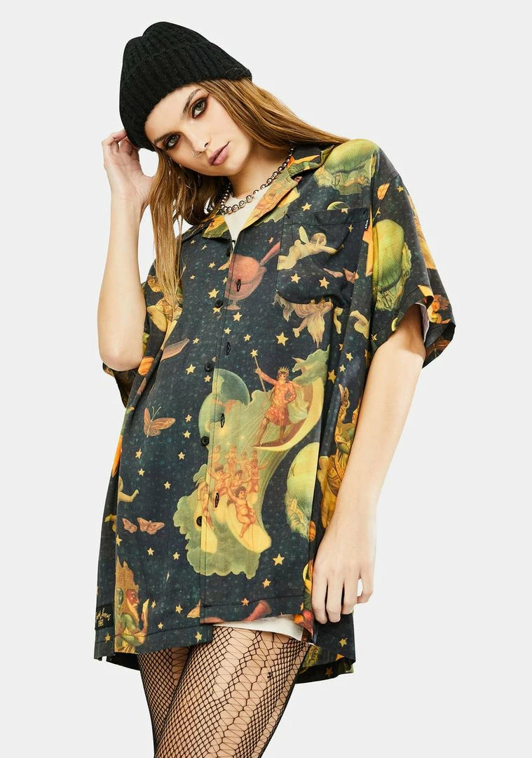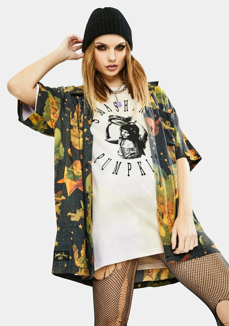 cuz with u every night is the night! This smashing pumpkins tribute silky button up top has victorian collage and star girl graphics inspired by the bandΓ’ΒΒs Γ’ΒΒtonight tonightΓ’ΒΒ music video all over, a front pocket, and collared neckline.