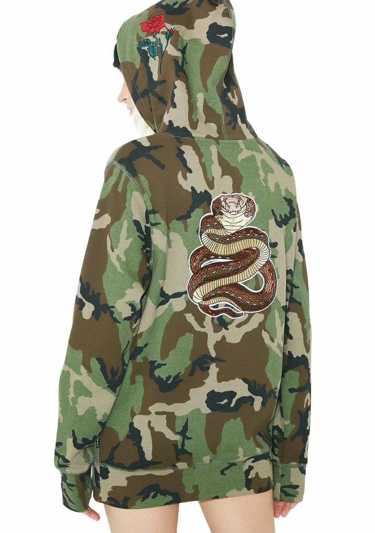 get ready for a sneak attack…this dope af camo hoodie has a relaxed fit, back cobra graphic, kangaroo pocket and drawstring hood.