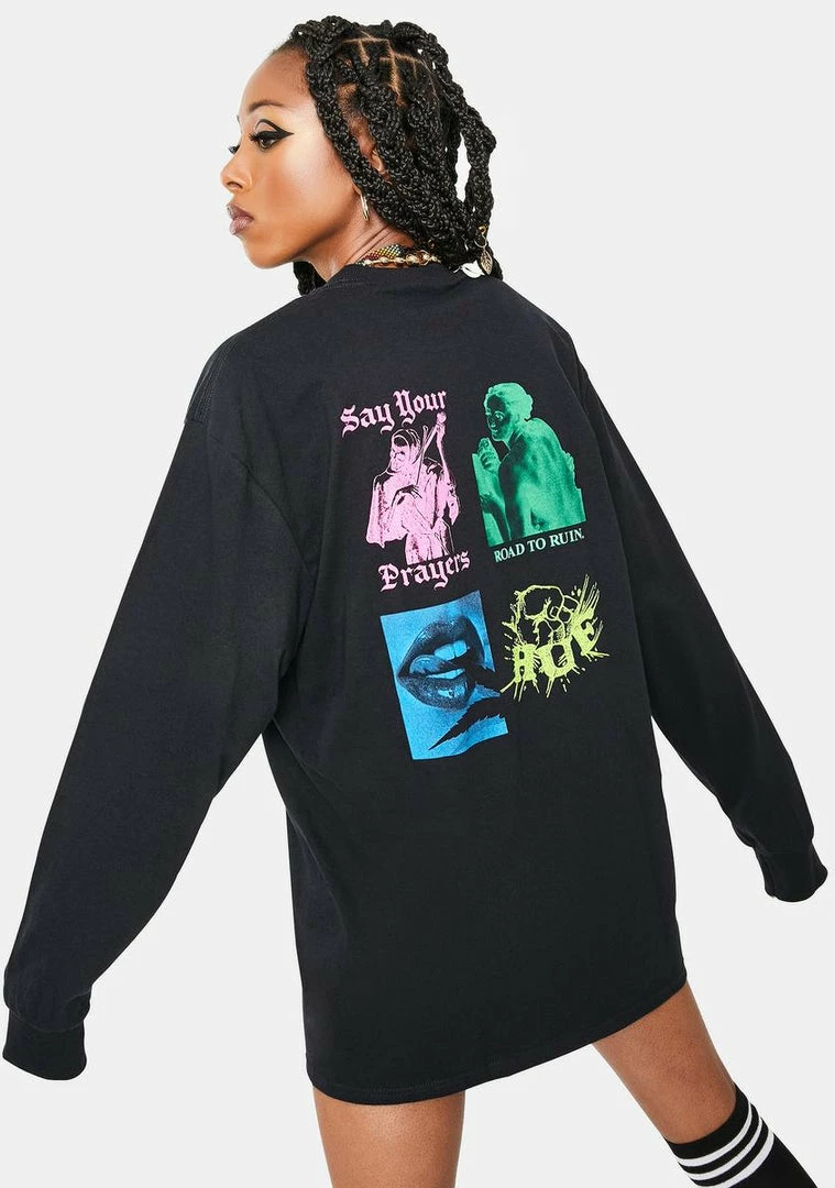 gotcha feeling the butterfly effect. This trippy long sleeve tee a relaxed oversized fit, a crew neckline, and sikk graphics on the front & back that say âSay Your Prayers, Road To Ruinâ.