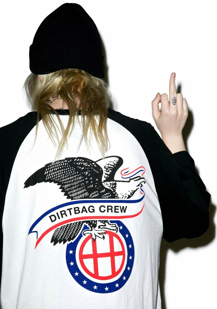 cuz yer just a teenage dirtbag, baby. This dope oversized baseball tee features exxxtra long contrasting black three quarter length sleeves, cursive HUF logo on tha chest, and a bigass graphic on tha back reading รขยยDirtbag Crewรขยย on a banner carried by an eagle รขยยn Americana stars and stripes.