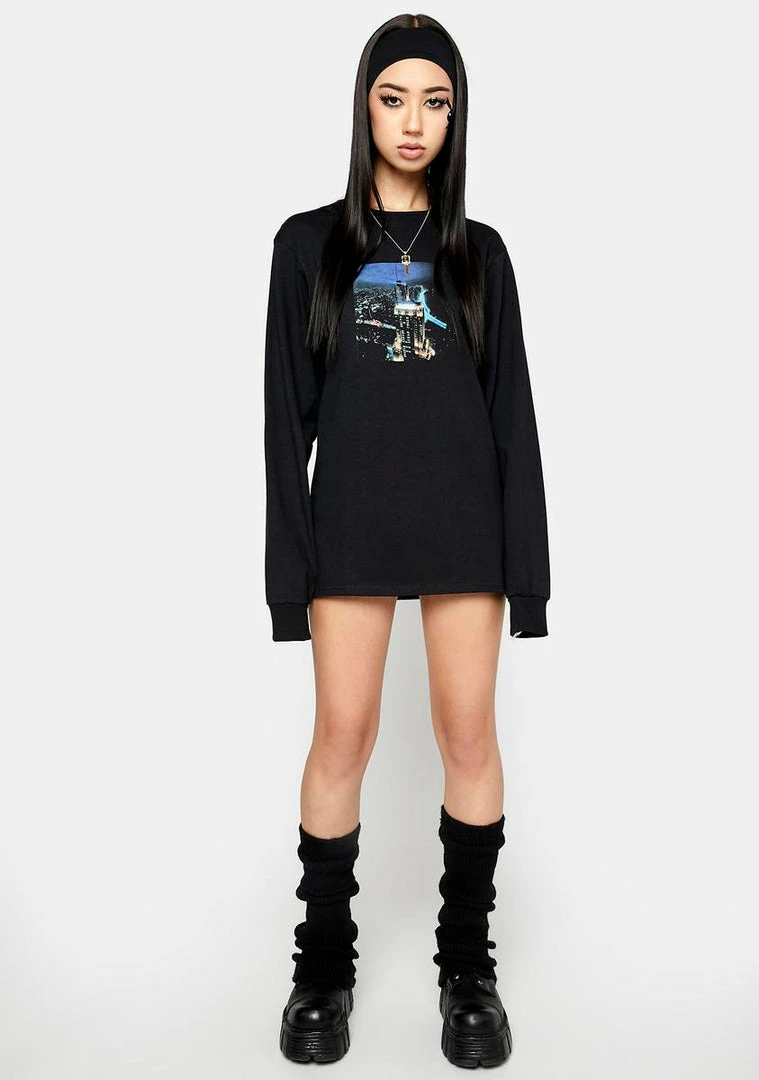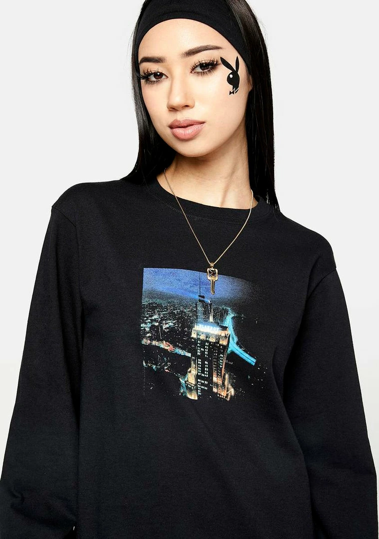 cuz the best times happen after midnight. This long sleeve t-shirt has a relaxed fit, a cityscape print on the front, and Playboy graphics on the back.