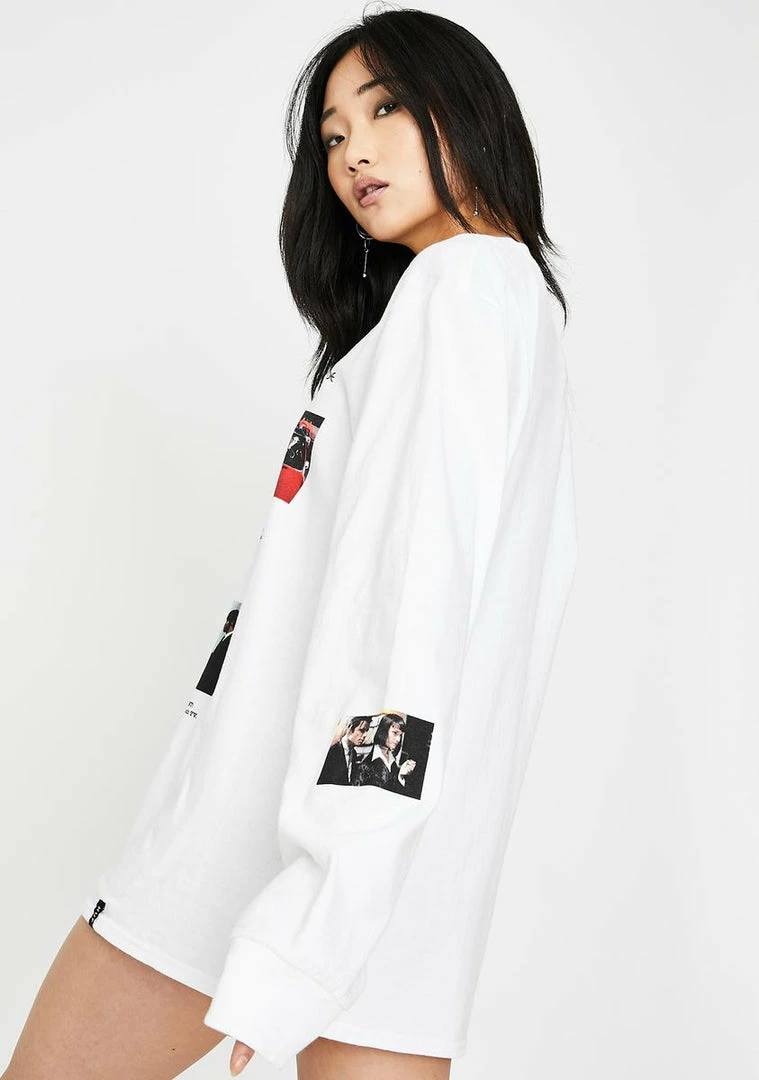 cuz youΓ’ΒΒre a moment frozen in time. TheyΓ’ΒΒll always remember ya name in this sikk AF t-shirt that has long sleeves, a relaxed fit, and iconic Pulp Fiction movie scene graphics all ova.