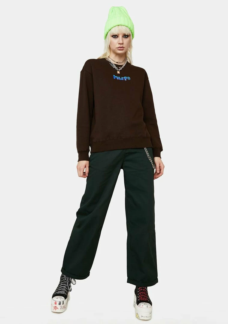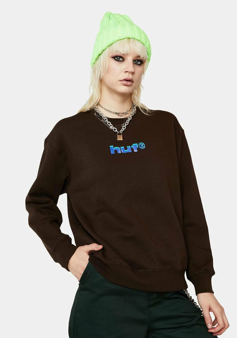 has ribbed trim at the cuffs, hem and crew neckline, an optical illusion Huf logo printed on the back, and a mini version on the front.