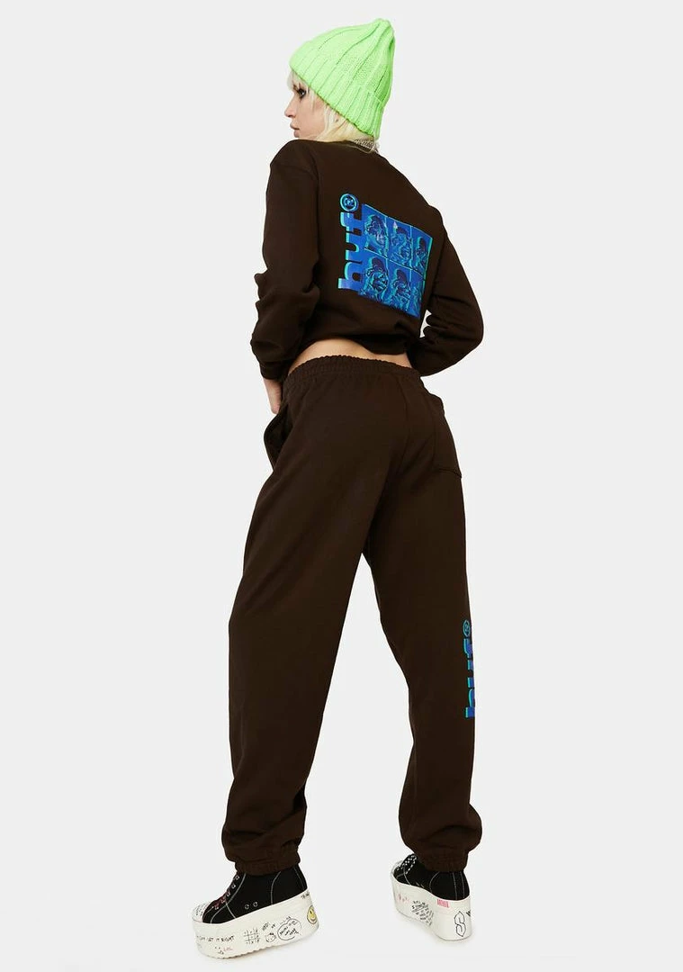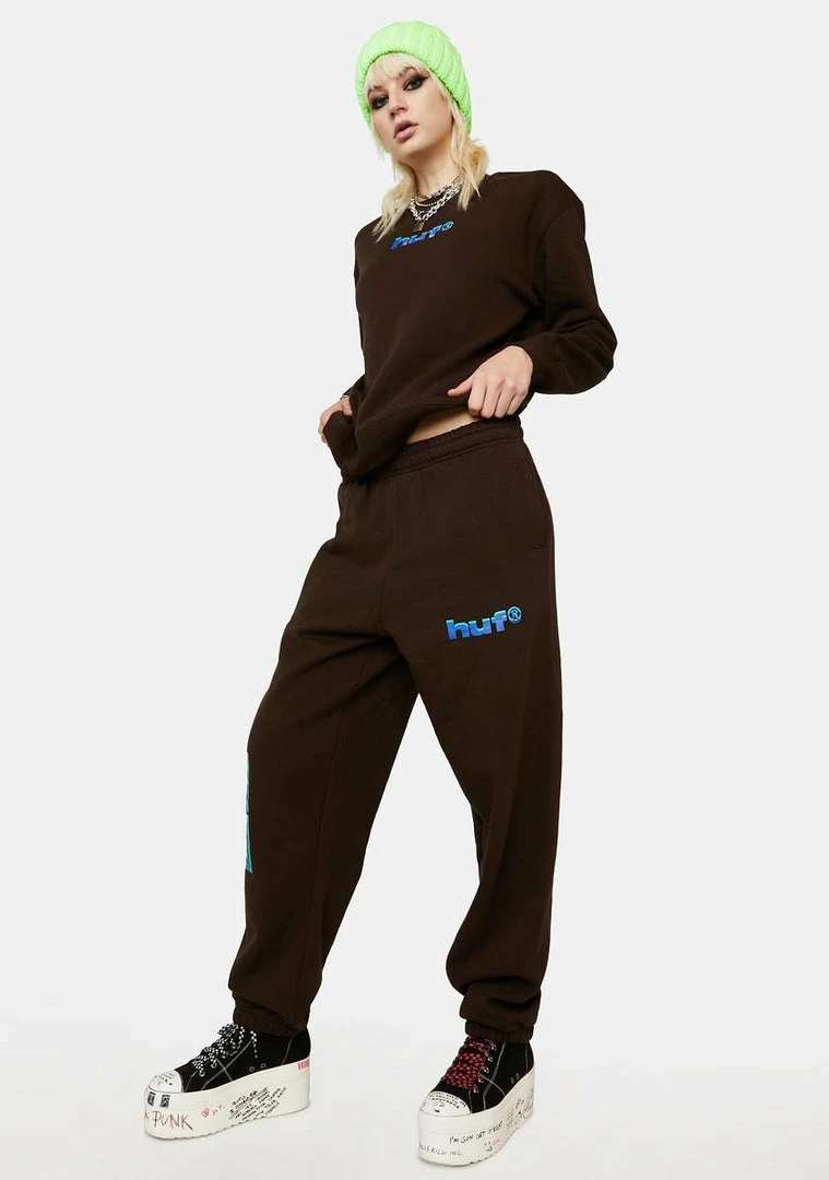 have an elastic waist and ankles, side pockets, and a Huf optical illusion logo printed on both legs.