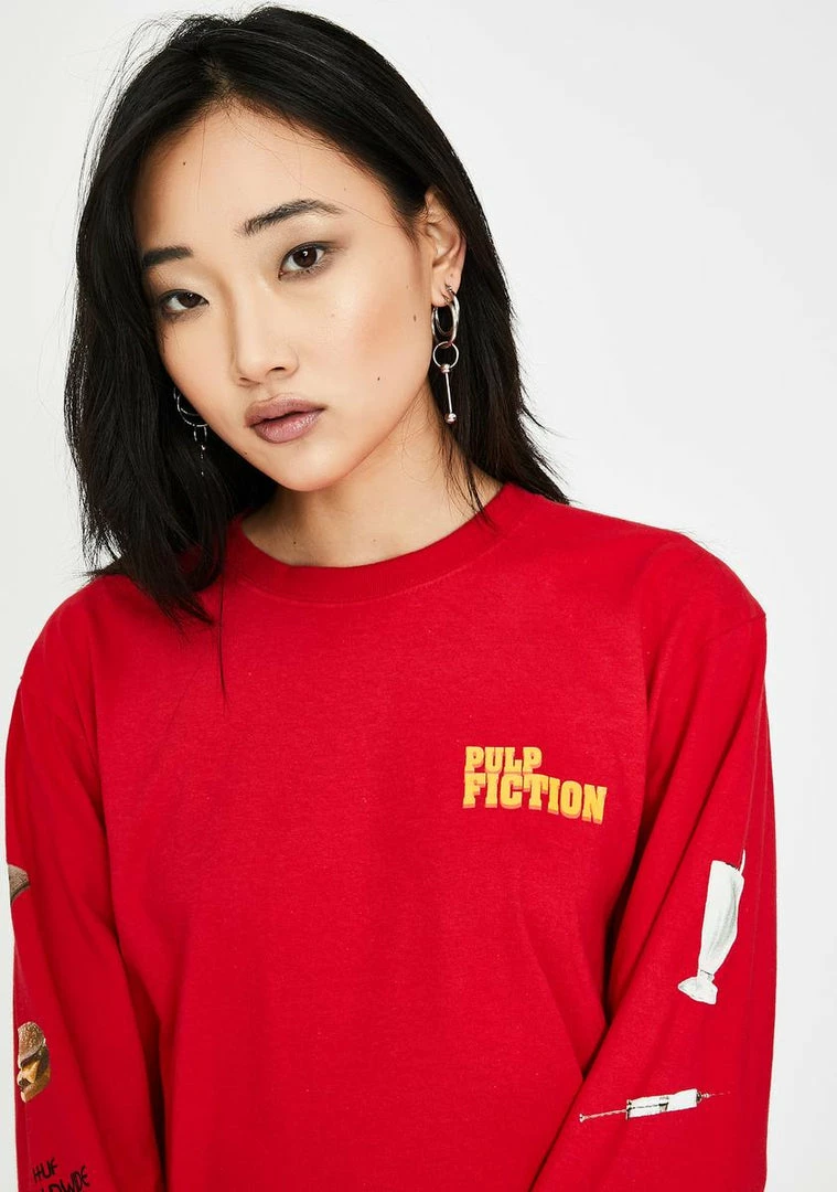 got ya wakinΓ’ΒΒ up from ur bad trip, babe. Look as juicy as a grand royale while wearing this long sleeve tee with a relaxed fit and killer Pulp Fiction inspired graphic designs all over the sleeves, front nΓ’ΒΒ back.