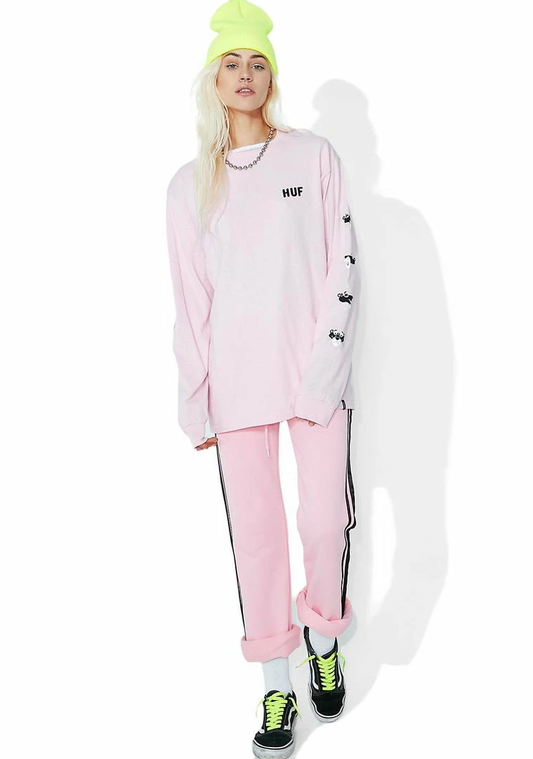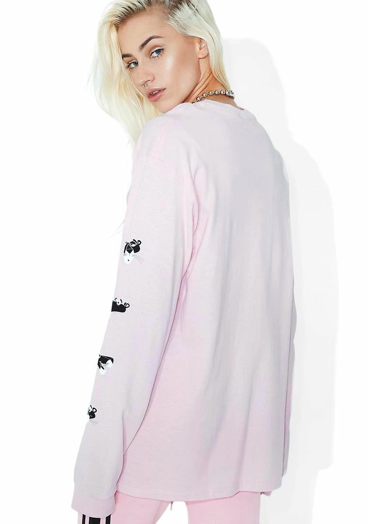 cuz yer the kween of serving face, bb. This classic graphic long sleeve tee features a relaxed fit, ribbed neckline, and special collab screen print of the Pink Panther with different emotions running down yer sleeves.